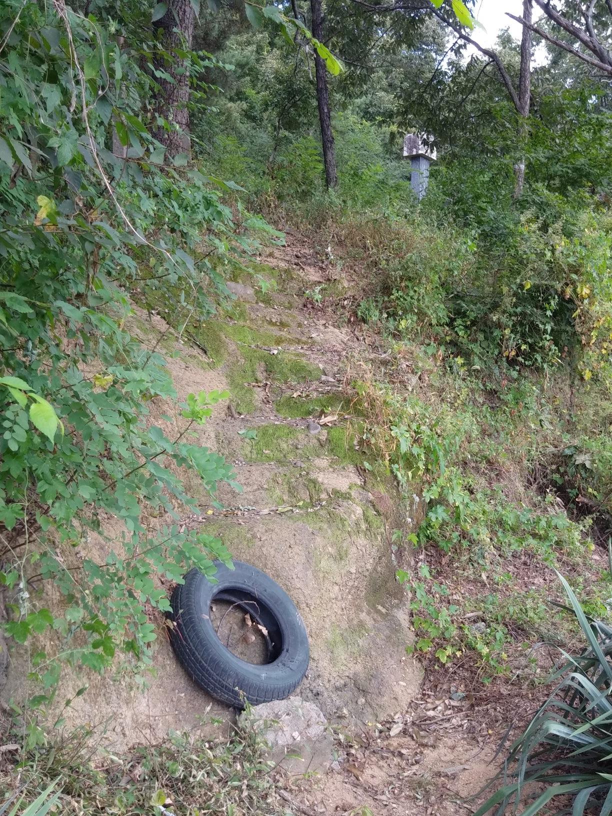 독립투사 황진박 선생 기념비 올라가는 계단길도 망가진 채로 있고 폐 타이어가 나뒹굴고 인근 인도에는 쓰레기가 가득한 상태다.