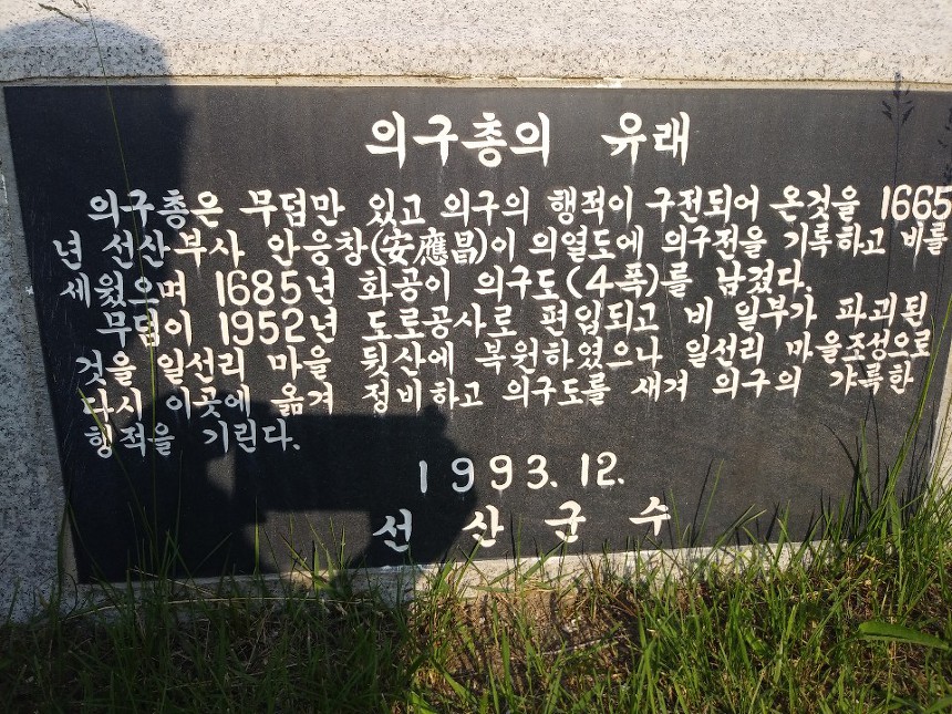 경북 구미시 산동면 인덕리 104-1 에 소재한 의우총(소무덤)과 경북 구미시 해평면 낙산리 산 148 에 위치한 의구총(개무덤) 구미시에서 잘 관리해 성역화를 해 놓은 듯 했다.