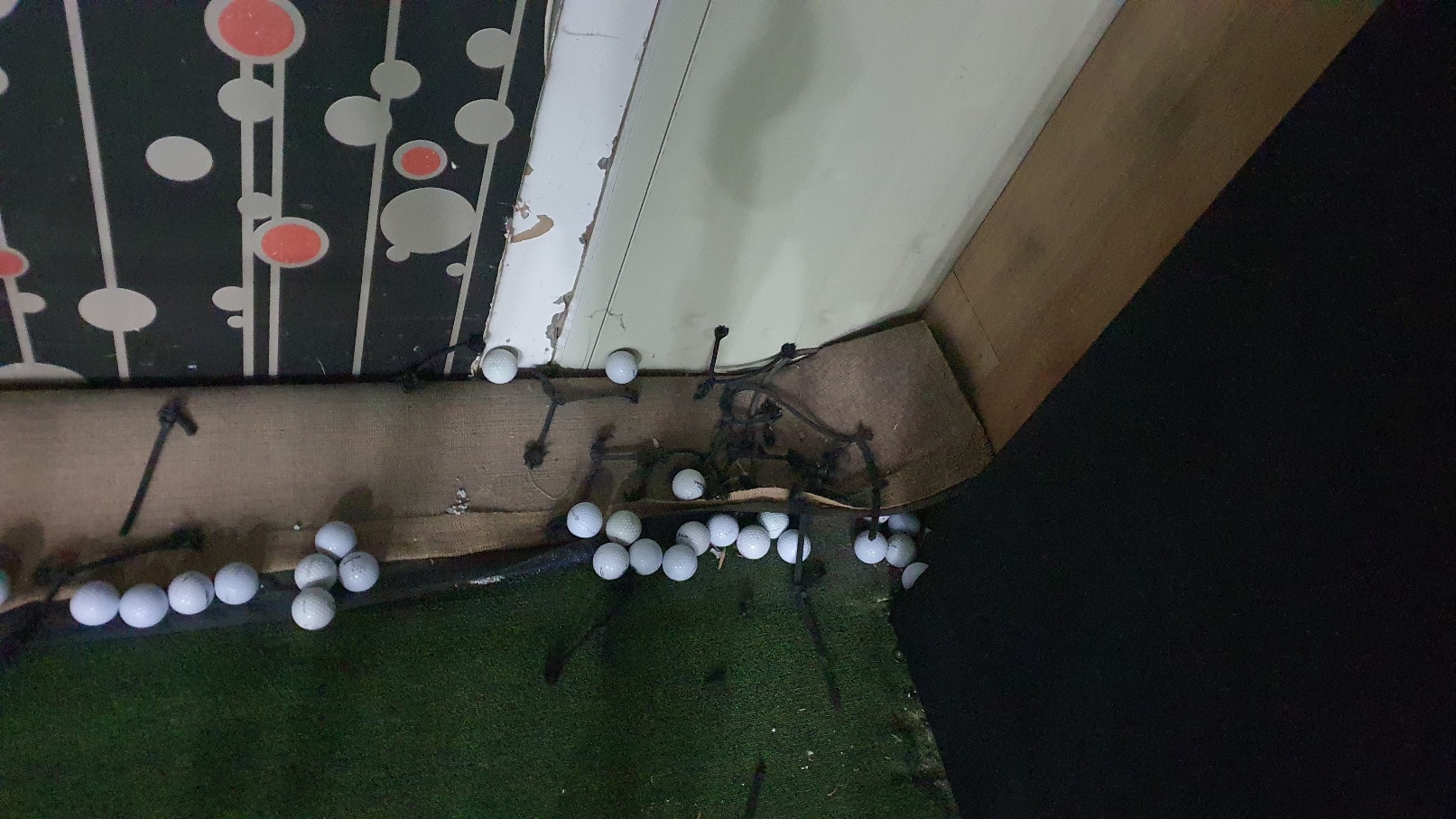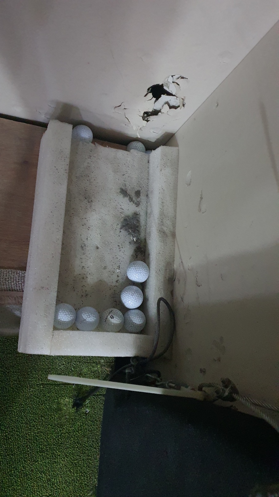 뒷벽으로 공이 넘어가 벽을 깨고 공이 넘어간 상태로 공을 꺼내기는 불가능, 스크린 천 뒤 아래쪽에 모여 있는 공 (자주 꺼낸다고 함) 구미 J 스크린 골프연습장 시공