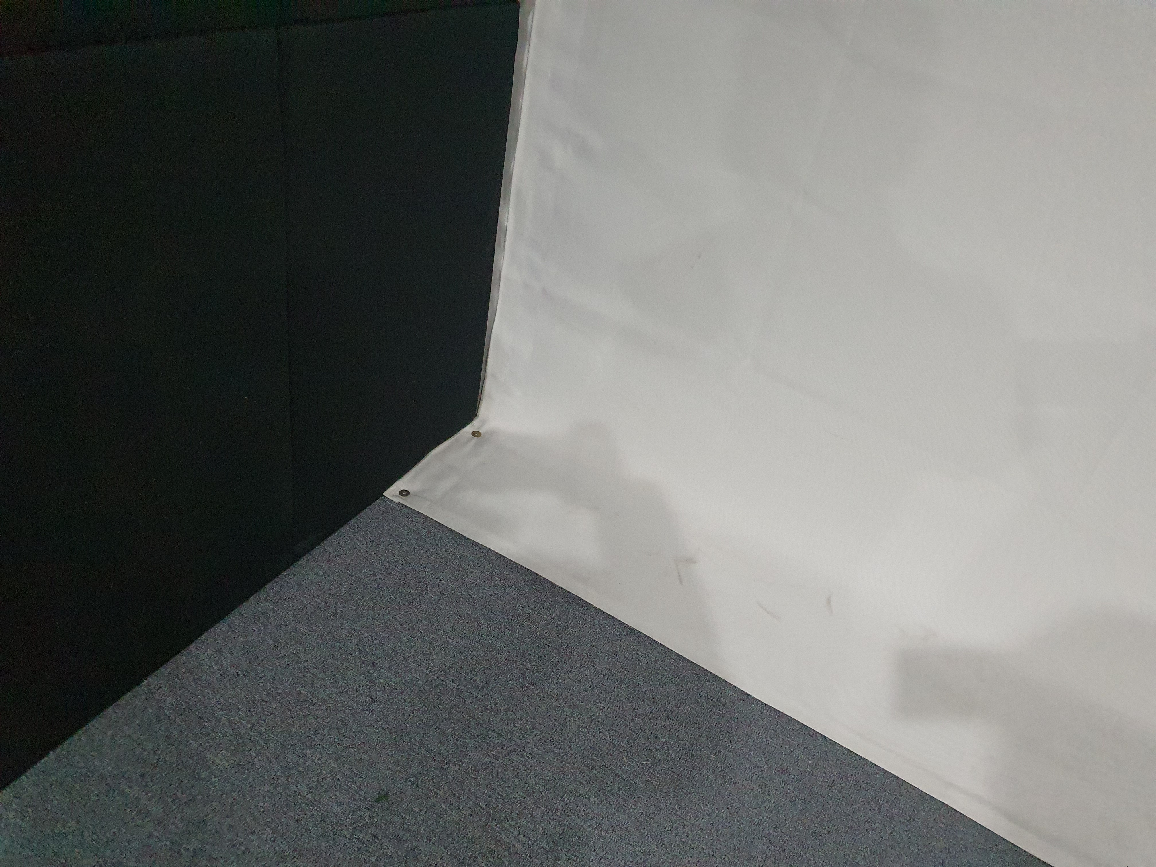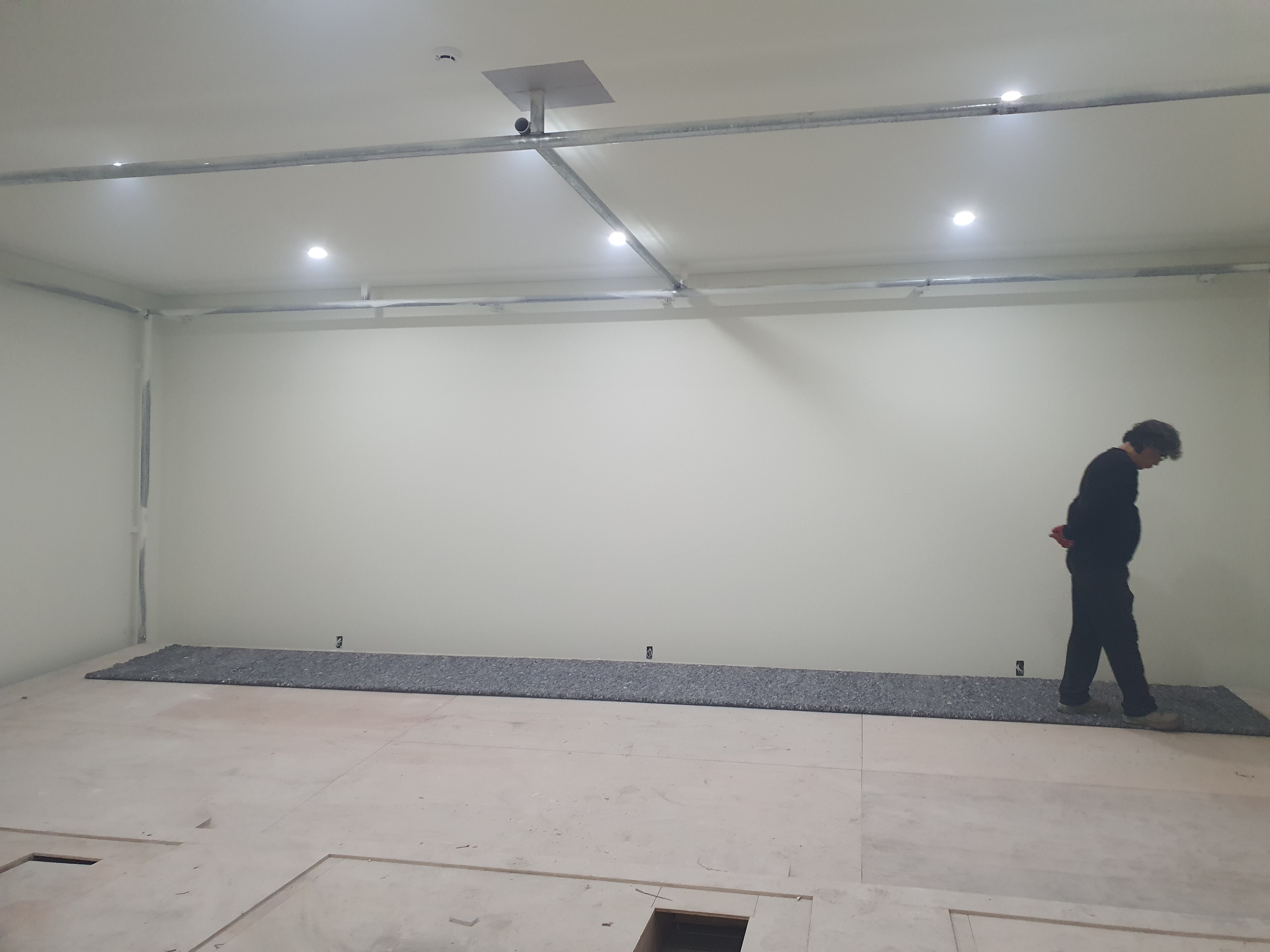 스크린 골프 룸 공사 - 메모리폼 부착과 스크린천 부착을 완료하고 카페트 설치, 타석매트 설치가 이어집니다.,