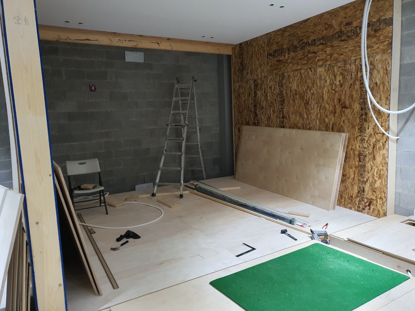 스크린골프 룸 공사를 할 때 벽체와 바닥 합판 사이에 5 cm 정도 홈을 따줘야 경사진 슬로프를 따라 메모리폼 부착시 홈 사이로 메모리폼을 넣으면 쉽게 마감이 됩니다.