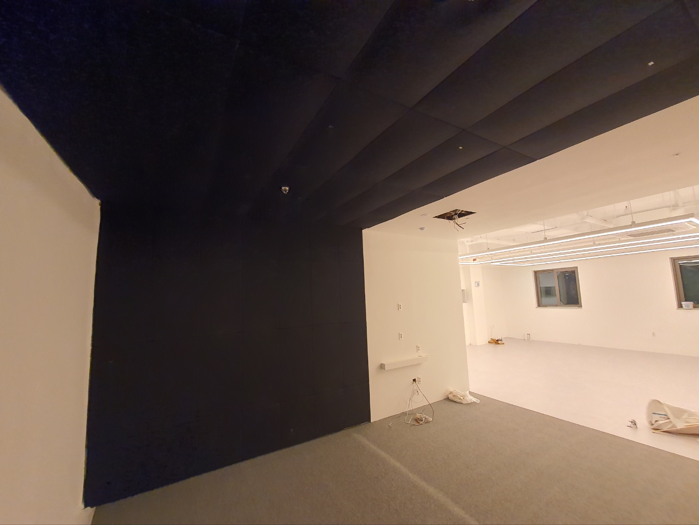 대구 두산동에 신규 오픈 한 골프 스튜디오, 목공사가 마무리 된 현장 모습입니다. 여기에 천장과 벽에 메모리리폼을 부착하고 바닥엔 카펫트를 시공합니다.