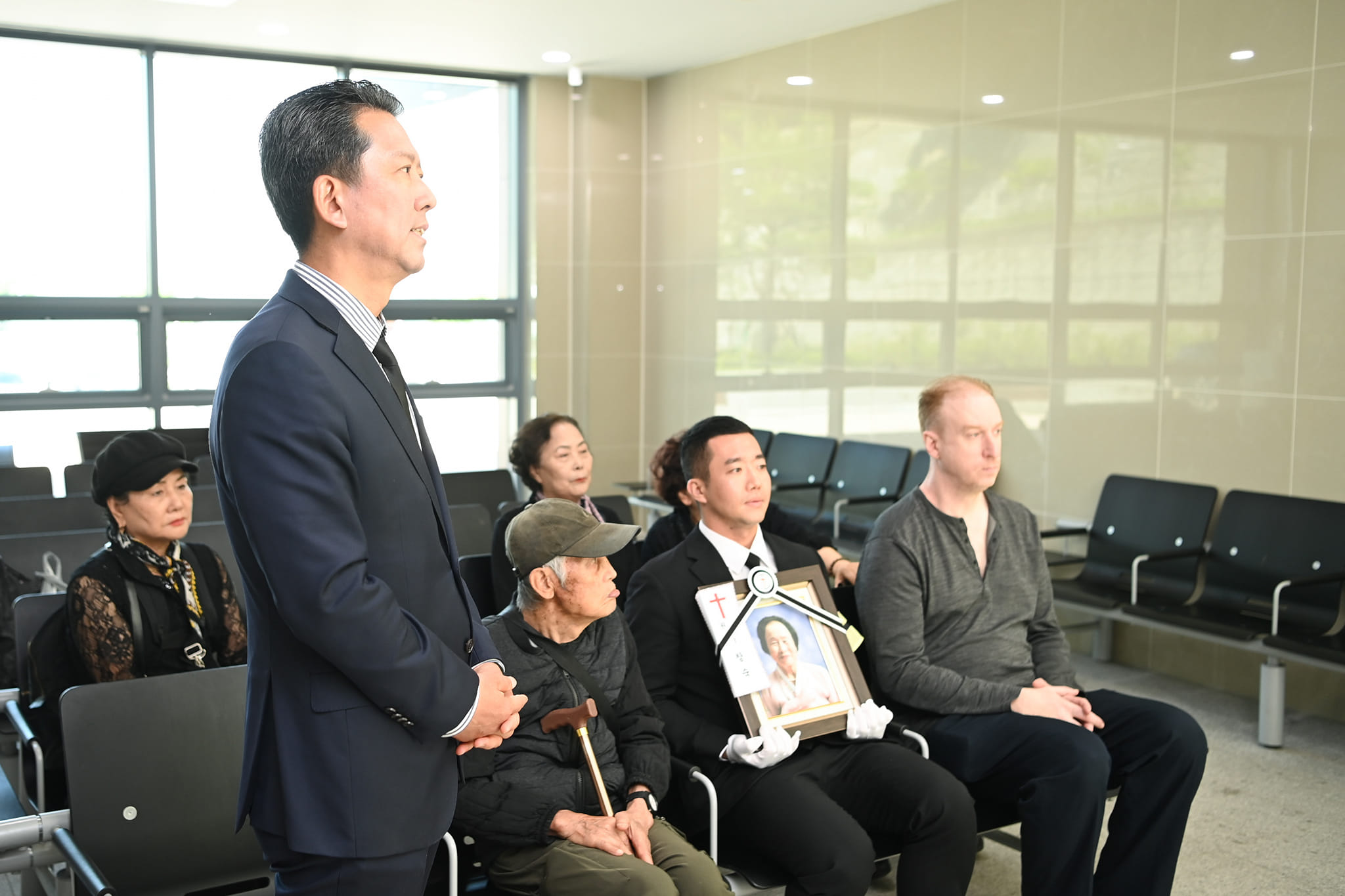 고 이창숙 여사의 사위 스티브 씨를 위로하는 김장호 구미시장. (사진 ⓒ구미시)