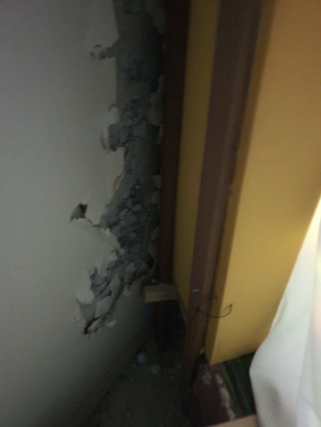 스크린골프룸은 천도 찢어지고 공이 스크린과 와이어 사이의 틈을 따라 넘어가 뒷벽과 옆벽에 많은 타격을 주어 석고판이 부서져 있네요. 천장에도 공이 많이 올라타고 앉아 있습니다 ㅠ.ㅠ