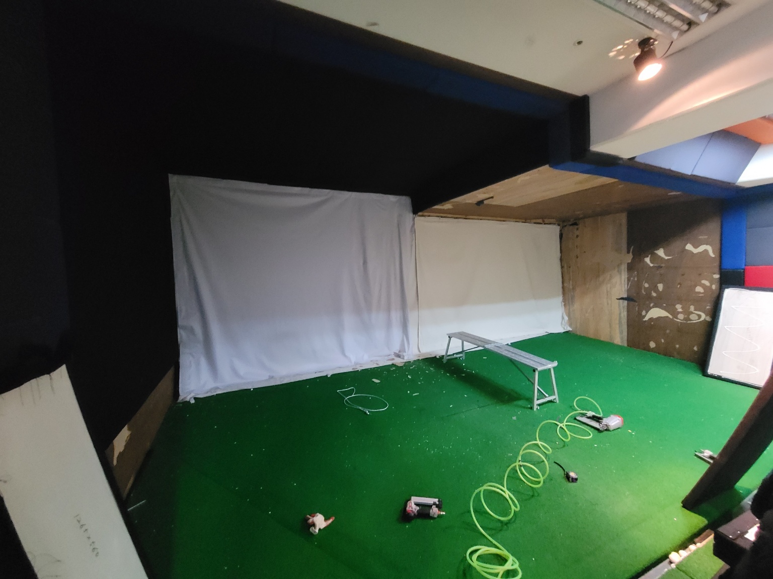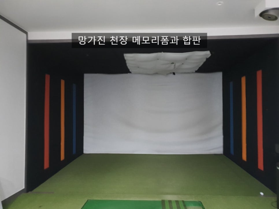 스크린 룸이 5개 연습장 타석이 4개 있는 시흥시 신천동 골프존 비젼플러스 골프장입니다. 새로 인수하신 점주님이 이전 점주가 천장 메모리폼 망가진것을 저렇게 스크린천을 덧대어 보기 흉하다고 공사 의뢰하신 것 입니다. 룸 5개 보강용 합판을 새로 붙이고 새 메모리폼을 시공해드렸습니다.