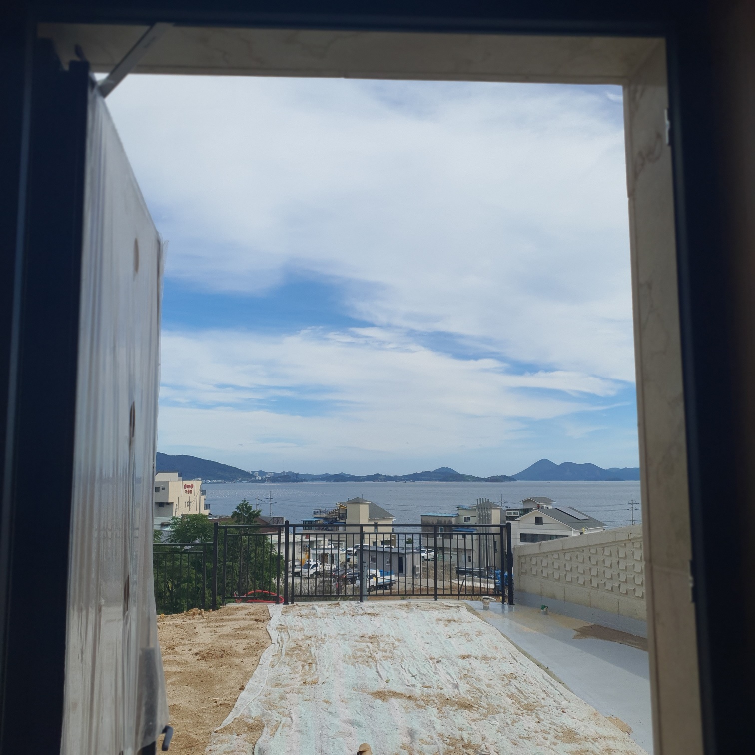 전원주택 개인골프룸에서 바다가 훤히 보입니다. 층고가 매우 높은것을 확인할 수 있습니다. 집주인분이 워낙 골프를 좋아하시는데 이런 좋은 경치에 친구분들과 멋진 시간을 가질 공간이 마련되었습니다.