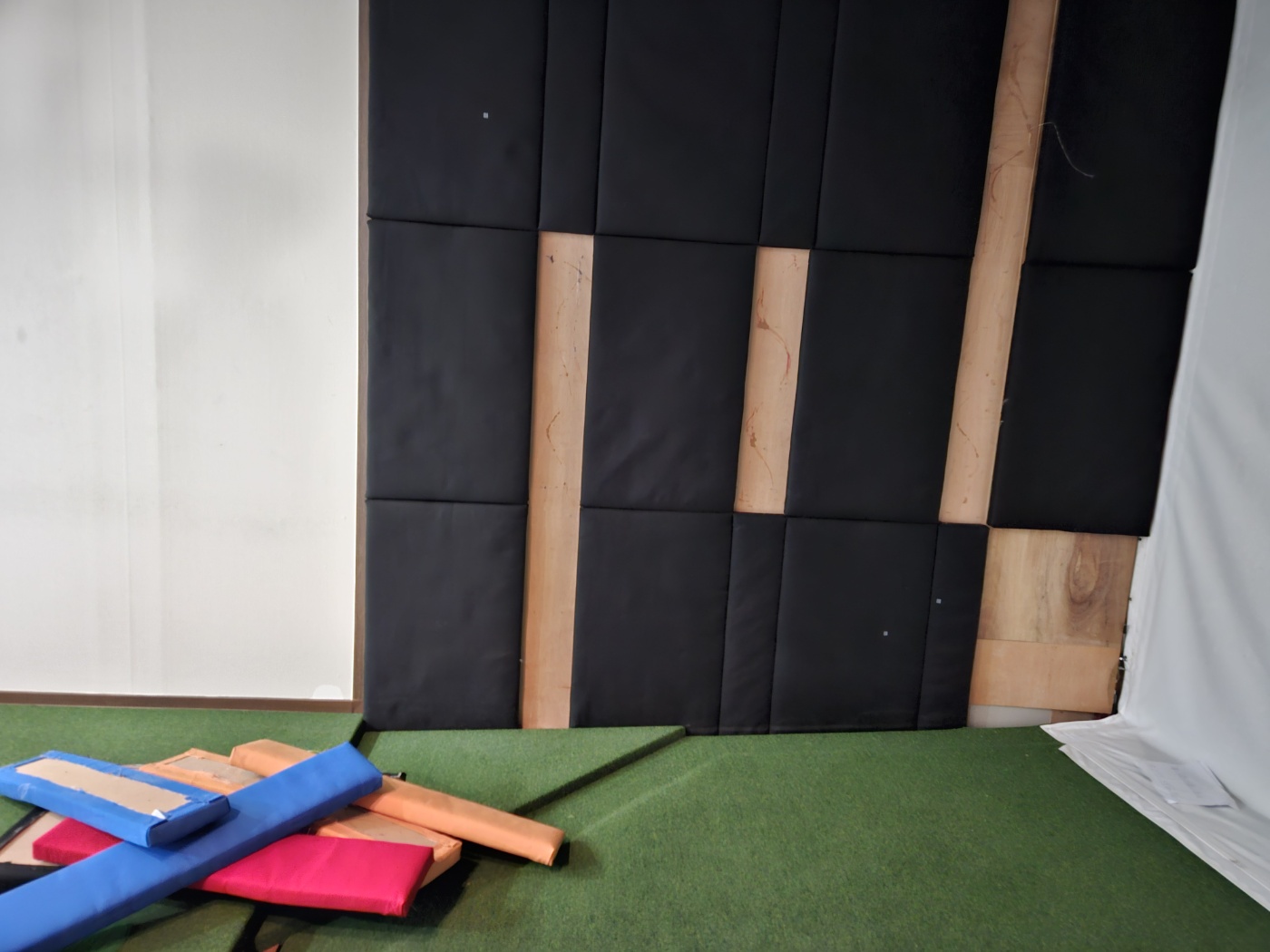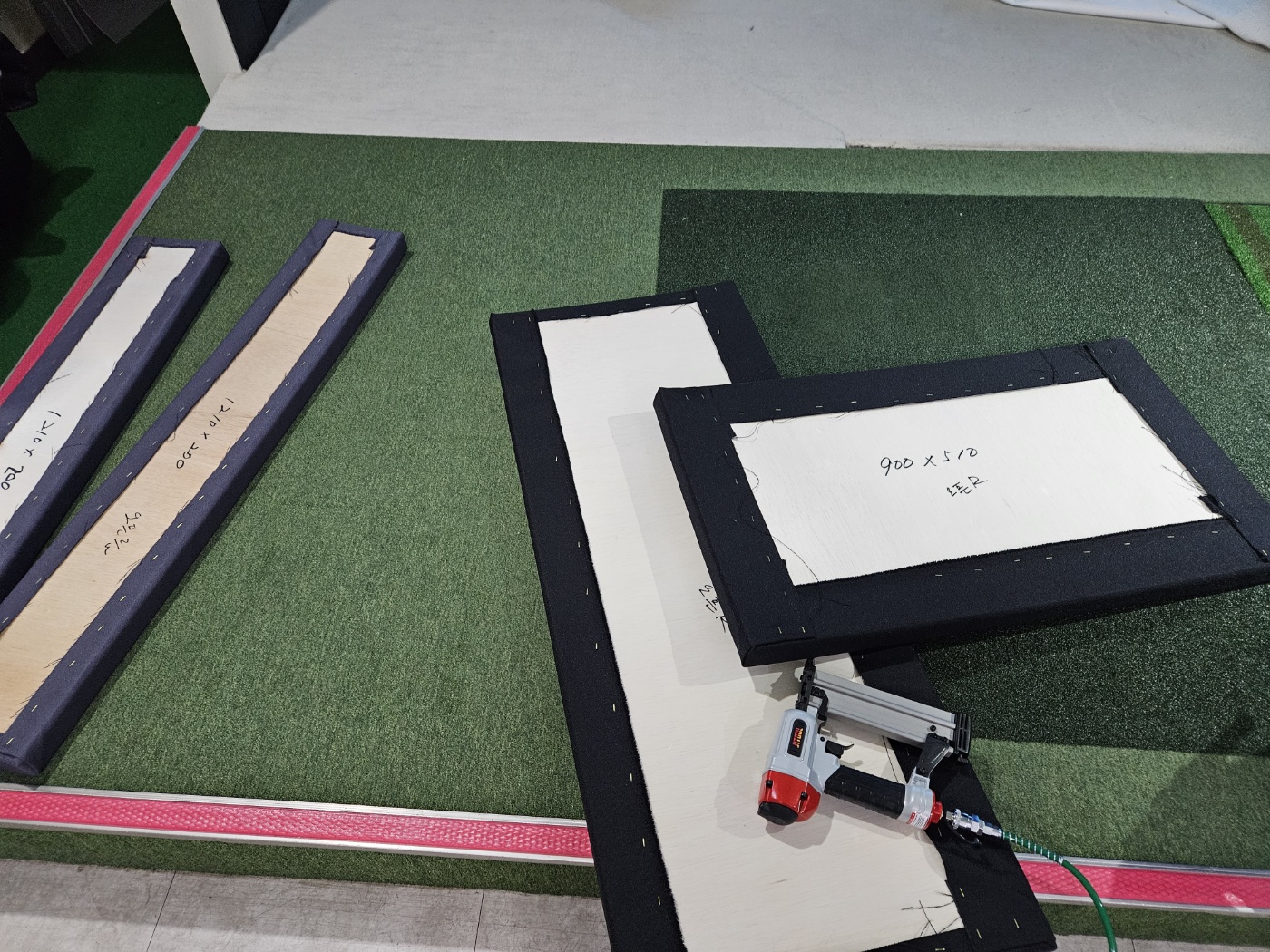 충남 계룡시 스크린골프장 1번방에서 7번 방 까지 낡고 훼손된 메모리폼 철거하고 1000X200 사이즈 폼은 망가진것 폐기하고 현장에서 쓸만한 기존 주황색, 빨강색, 파랑색 폼에 미리 재단해 서 준비한 원단으로 덧 입혀서 현장에서 제작한 폼을 다시 부착하여 모두 새롭게 교체했습니다.