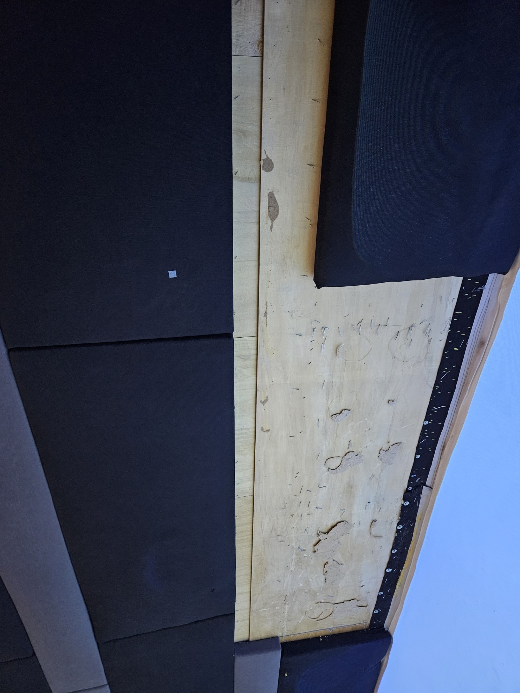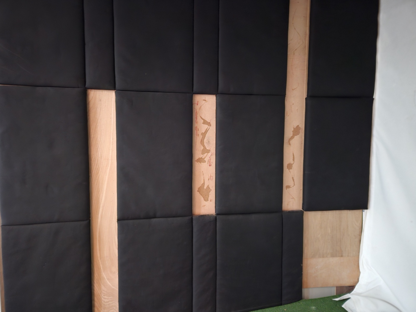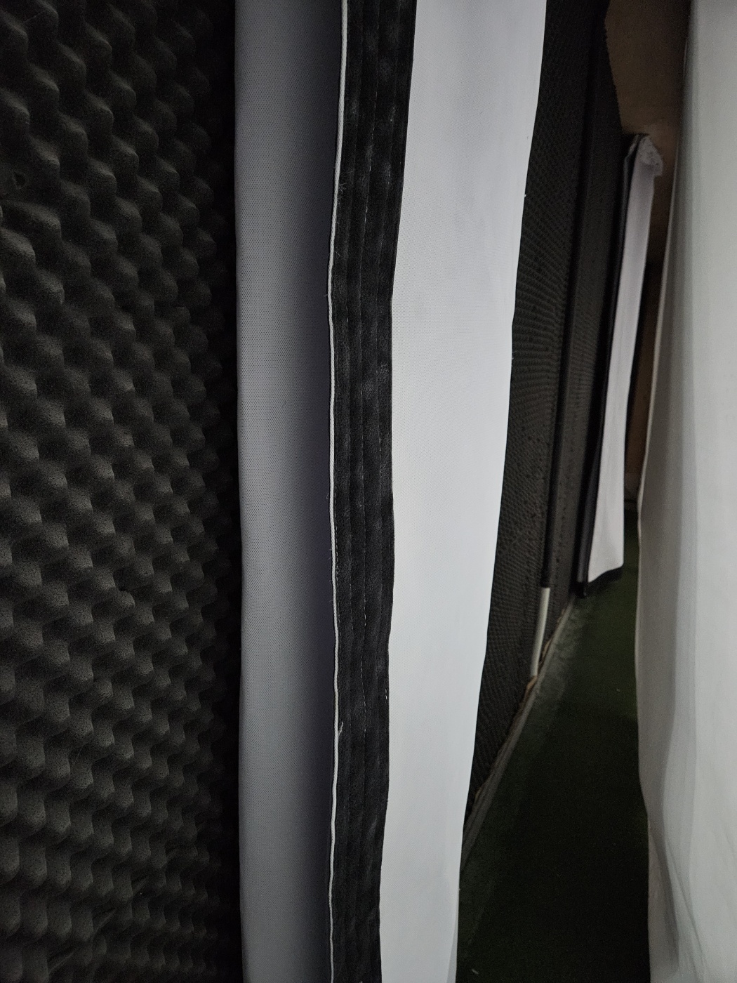 소음민원 때문에 뒷천과 벽 사이에 계란판 스폰지도 부착하셨는데 중간에 기둥이 있는 곳에는 탈거한 낡은 저소음 천을 보강 부착하여 공이 튕겨 나오는 문제도 해결했습니다.