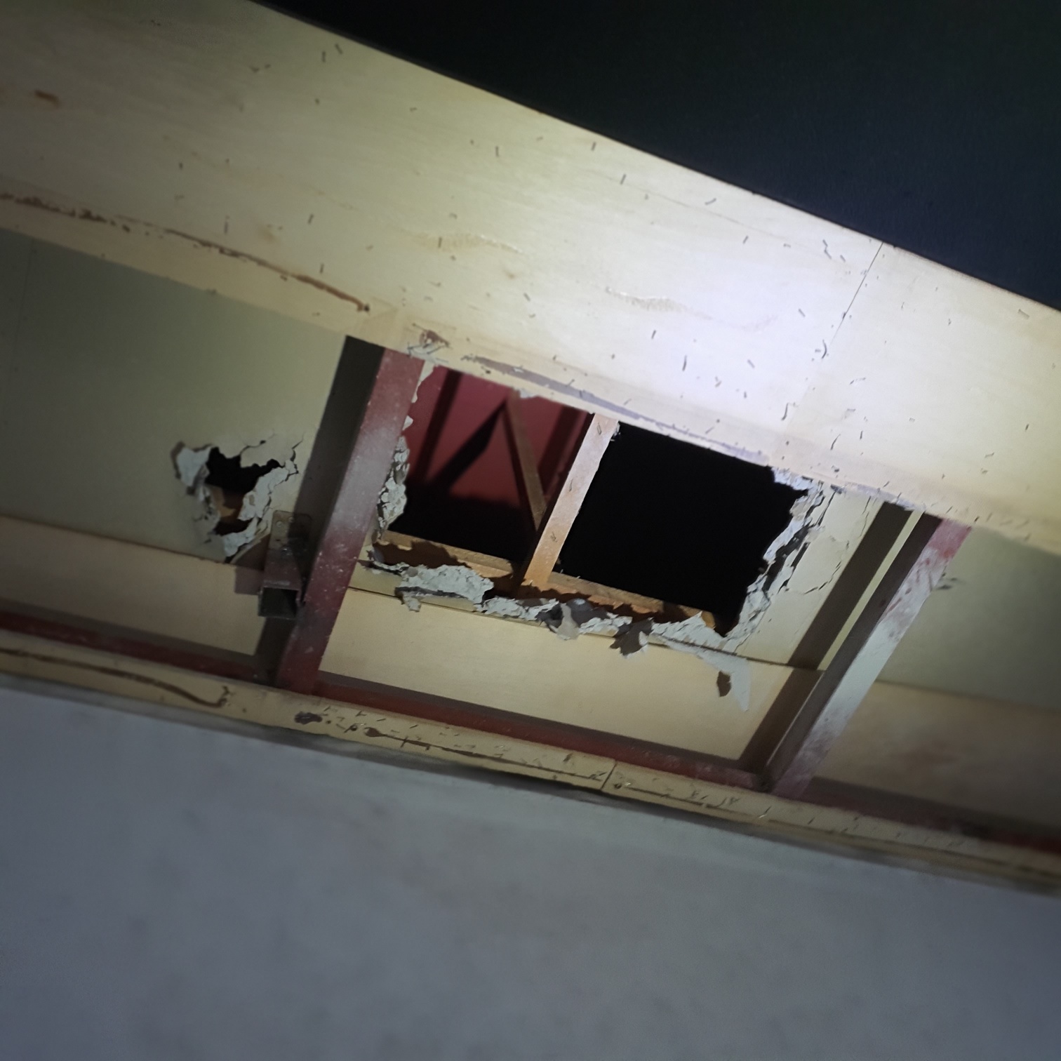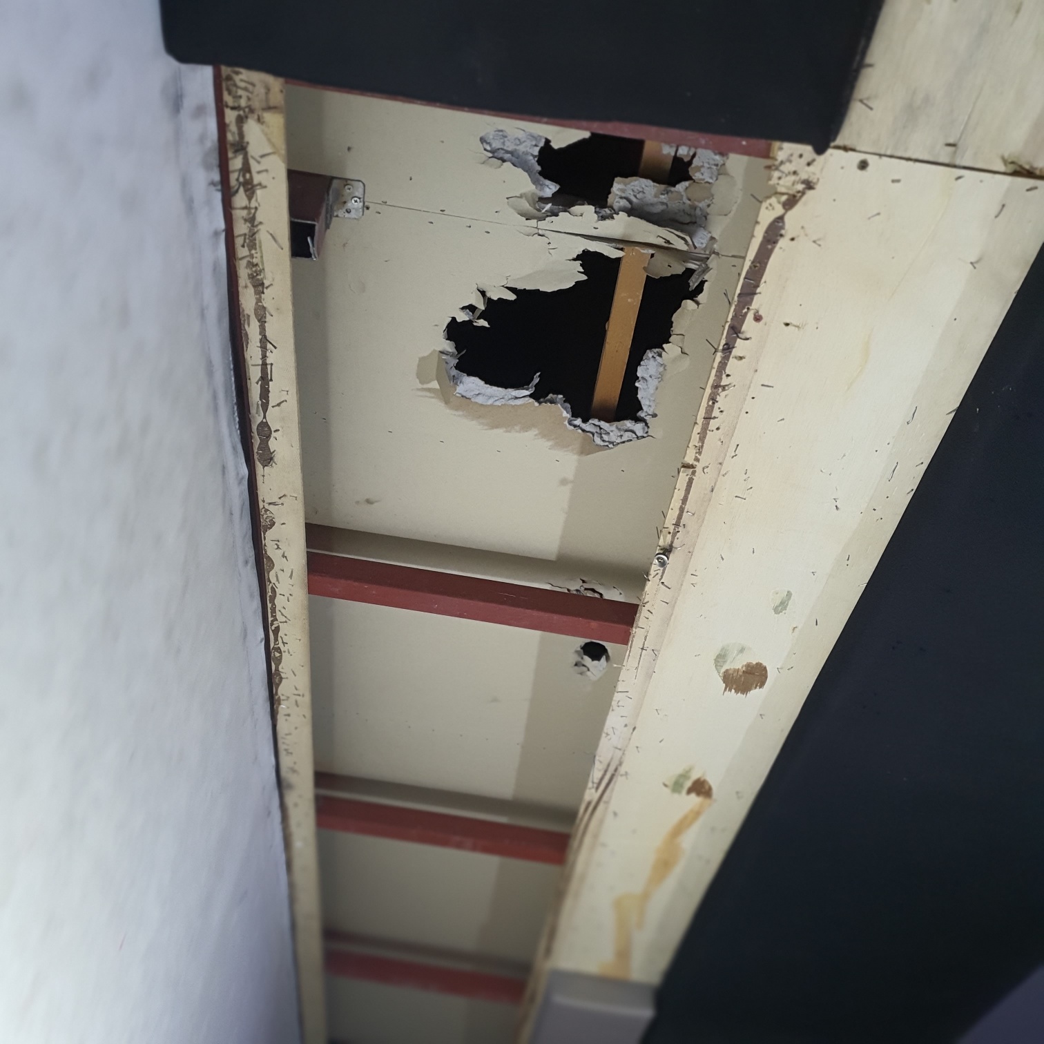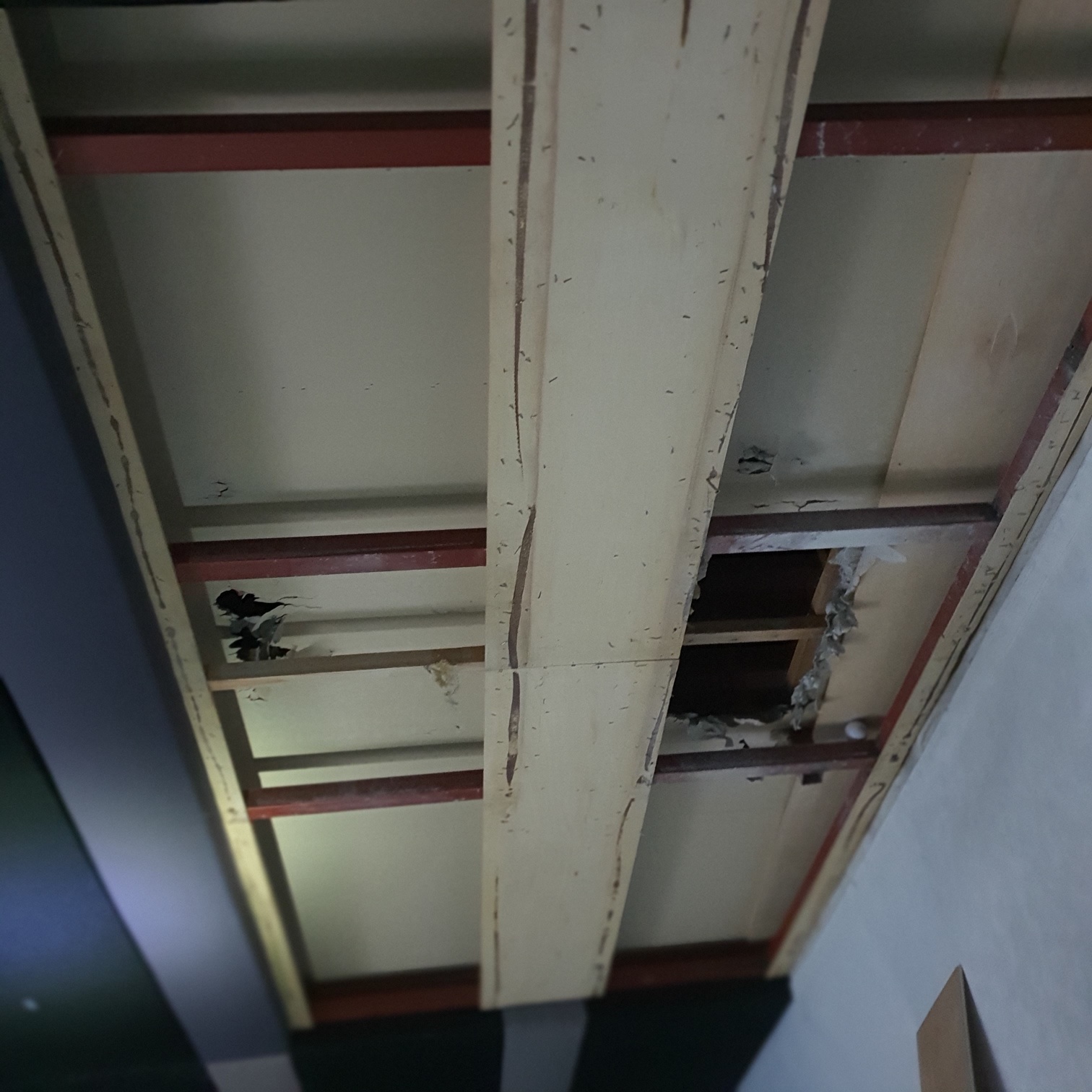 천장이 빵꾸난 상태인데 울산 목재소에서 9mm 합판을 잘라 와 현장에서 보강 처리 후 메모리폼을 부착 시공한 케이스입니다.
