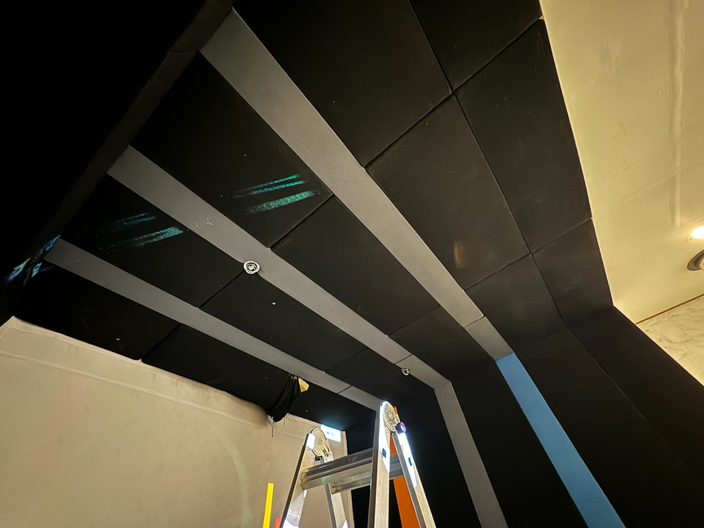 훼손이 심한 천장 메모리폼은 대부분 철거하고 파랑, 주황, 빨강색이 있는 1000X200 사이즈는 모두 블랙톤으로 처리하여 요즘 트레드인 올 블랙톤으로 꾸미기로 했습니다.