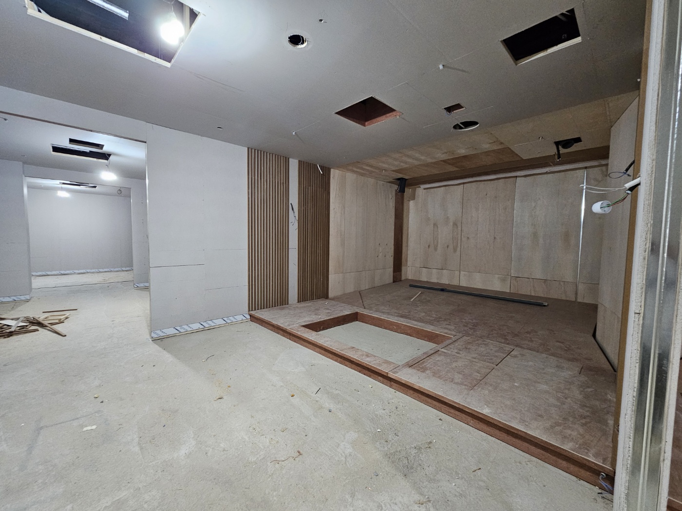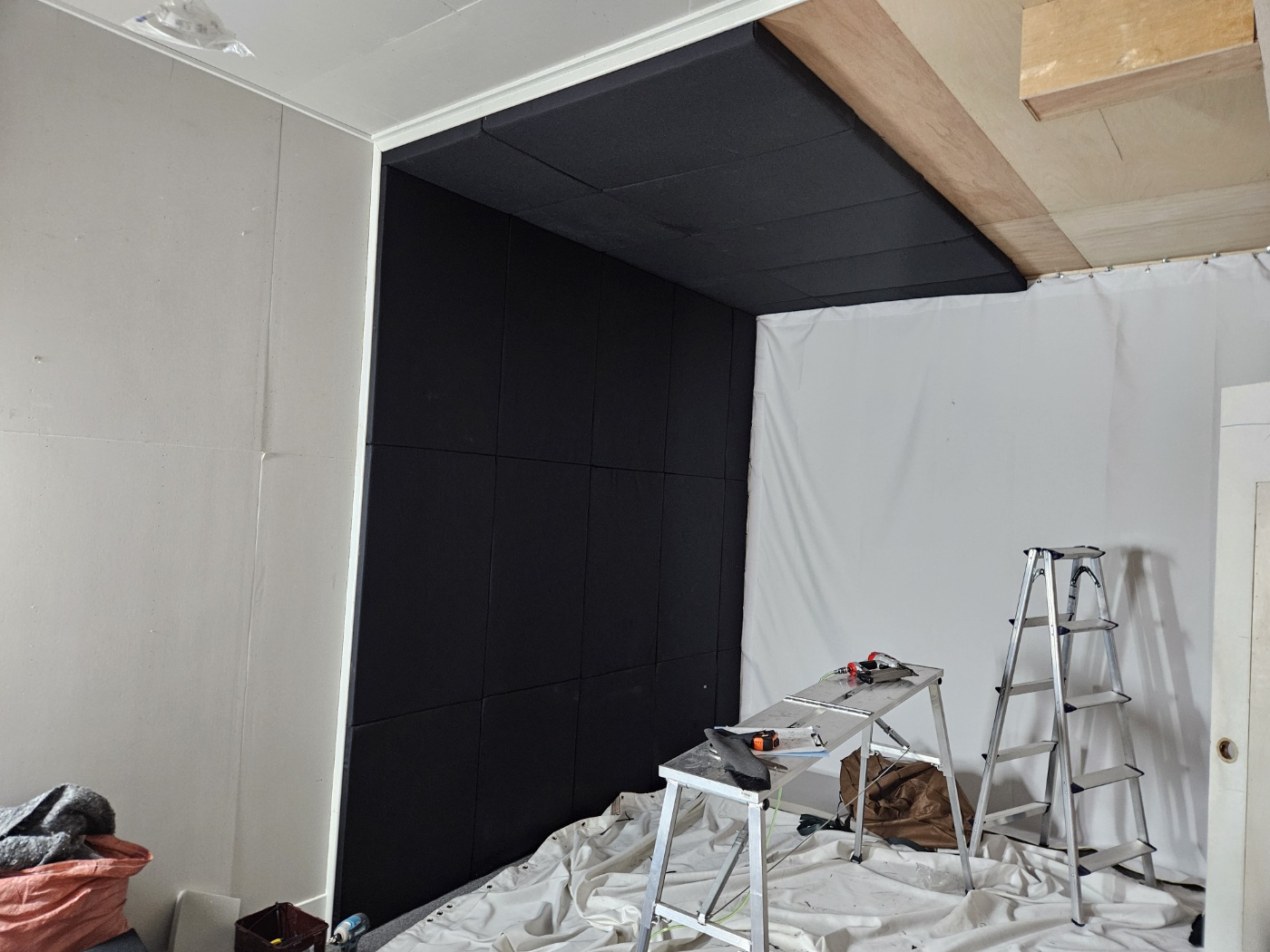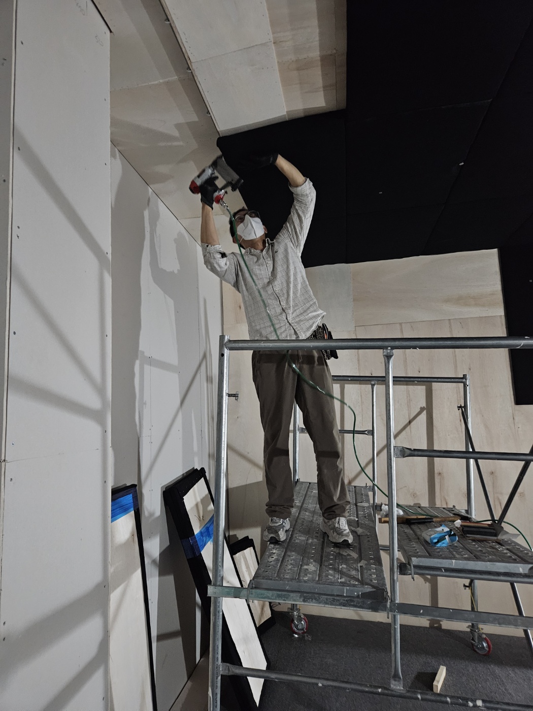11개 스크린룸에 들어가는 자재들도 많고 준비해야 할 일이 많았던 현장입니다. 목공사가 마무리 되고 실측을 한 후 합판, 난연2급 메모리폼 원단, 불연재등을 주문하고 재단 작업 후 열심히 제작합니다. 소방법 적용을 받는 현장이라 카페트, 난연2급 자재등에 대한 시험성적서 서류등도 잘 준비해야 합니다.
