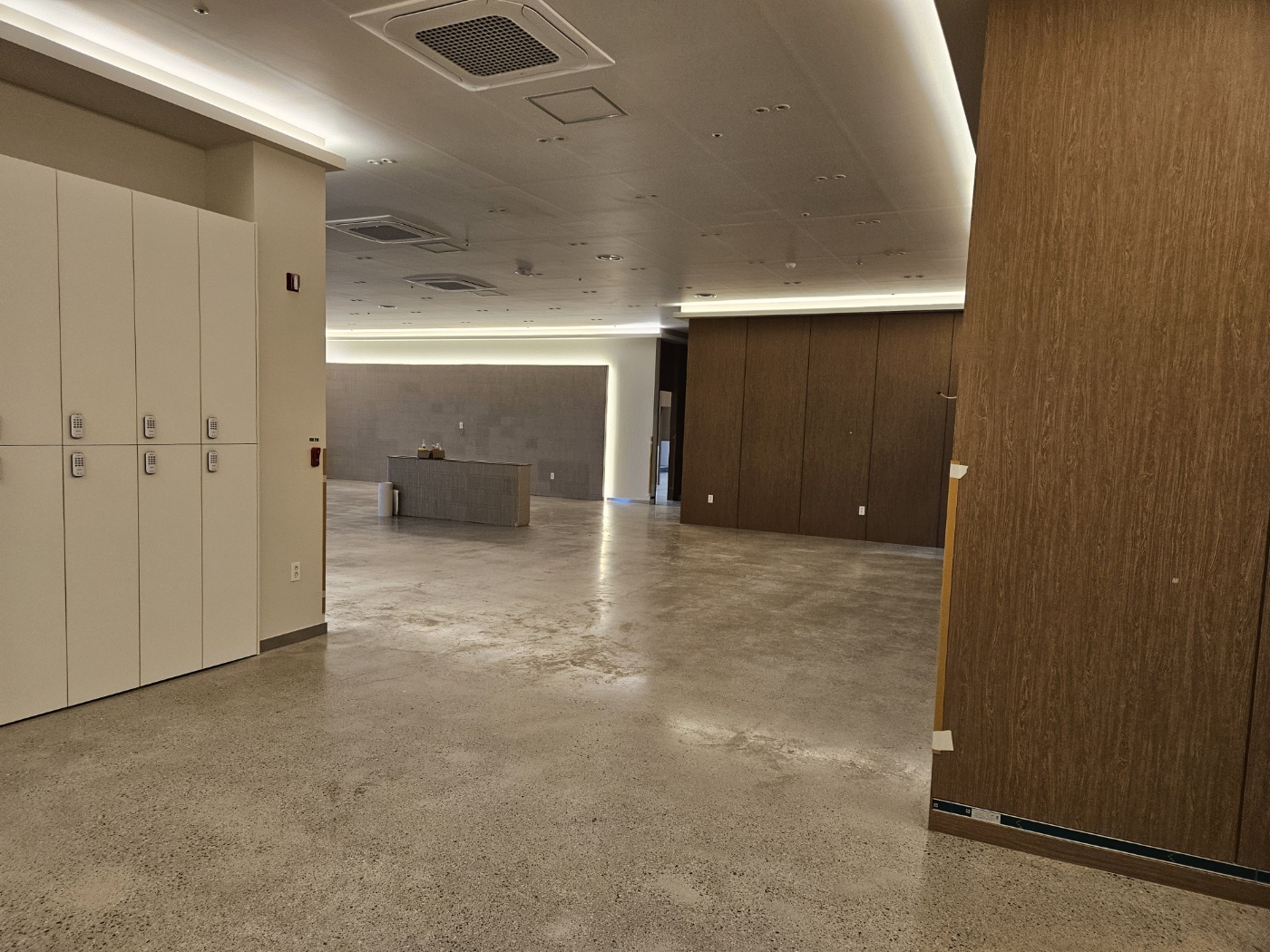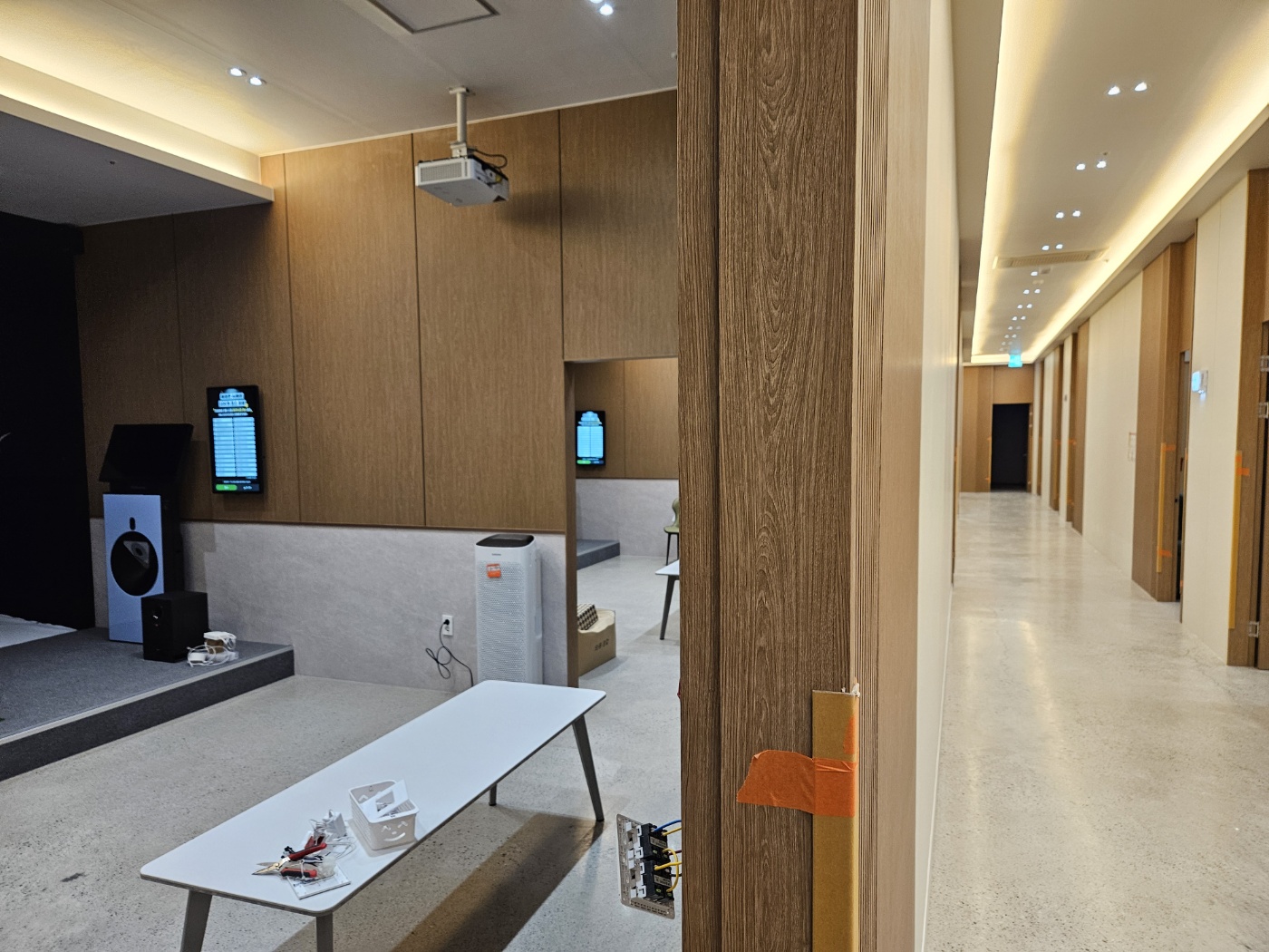 룸마다 벽체에 다른 색상의 타일로 마감했네요. 상당히 고급스러운 분위기 입니다. 인테리어에 많은 신경을 쓴 현장입니다. 11개룸 카페트 시공을 마무리 하느라 2인1조 2팀의 카페트 시공팀이 투입되었습니다. 굉장히 규모가 큰 스크린골프장이라 일단 확 트인 느낌이 매우 좋습니다.
