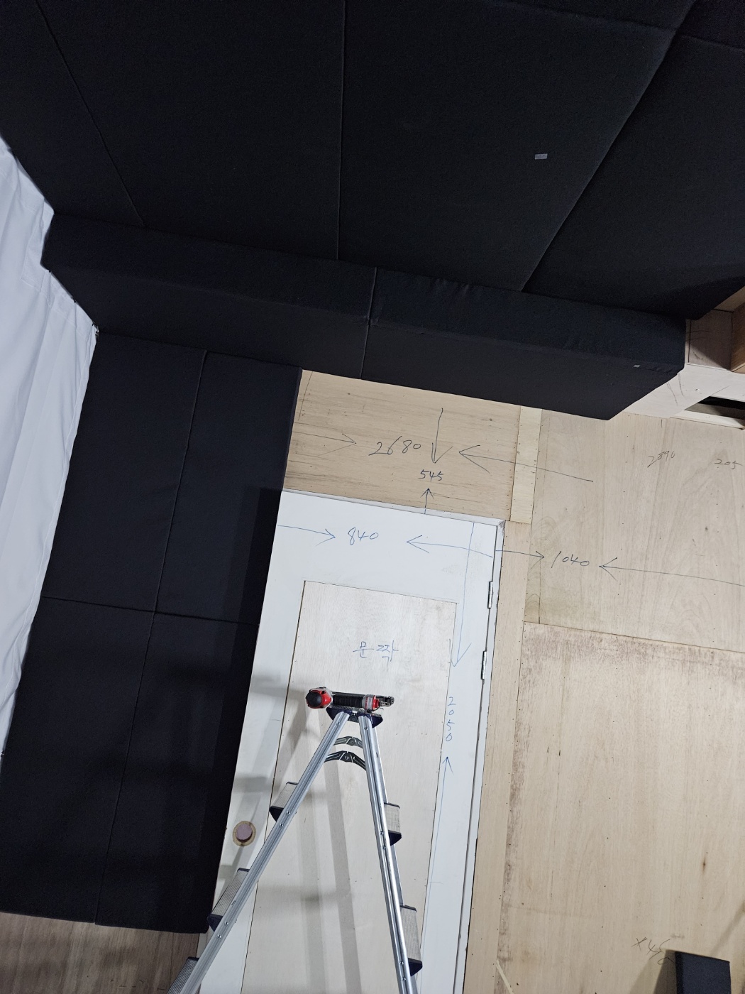 벽 옆으로 보가 지나가고 창고 문도 열고 닫을 수 있게 하고 점검구에 맞춰 메모리폼을 시공하려니 약간의 시간이 소요됩니다.