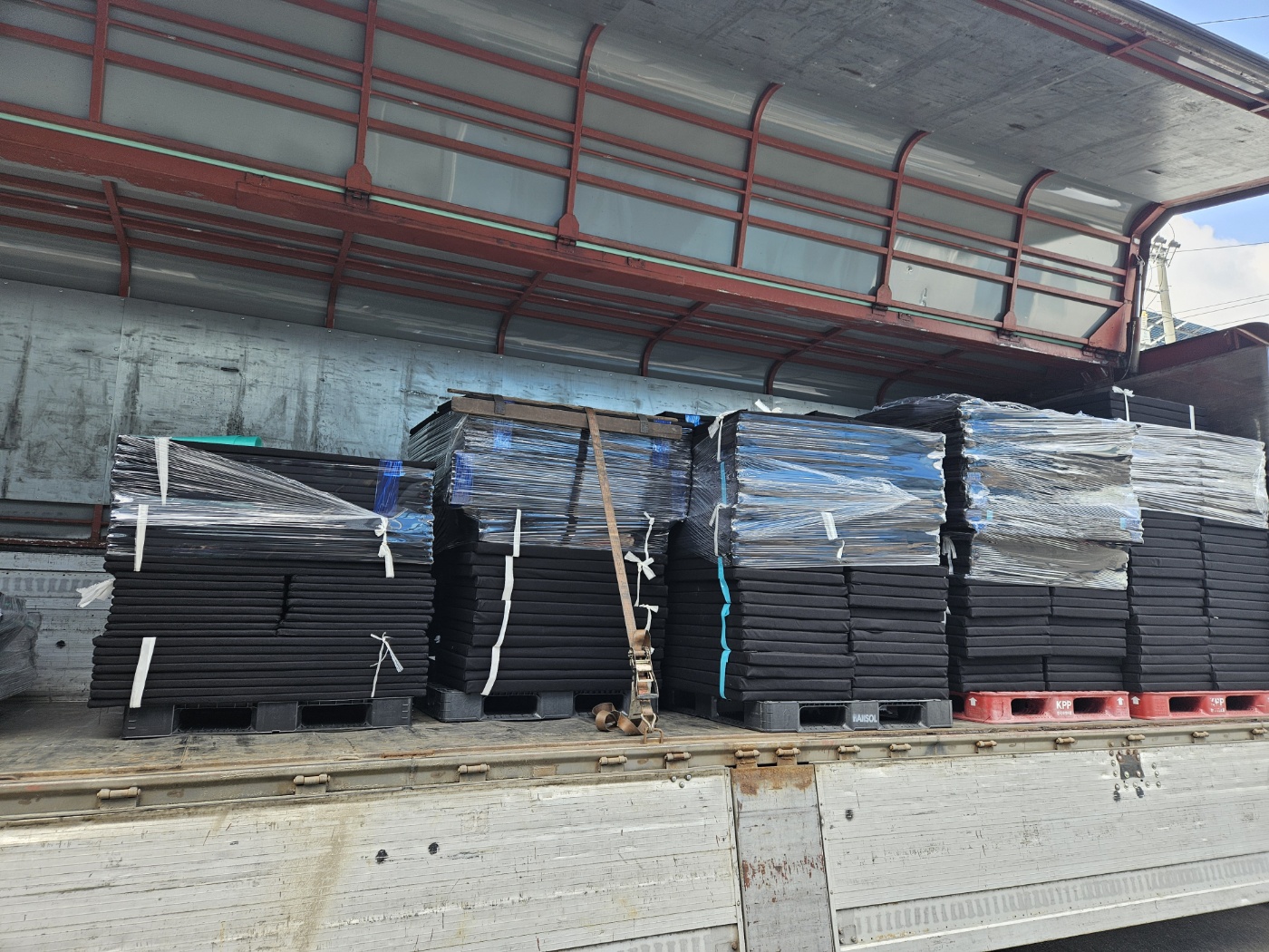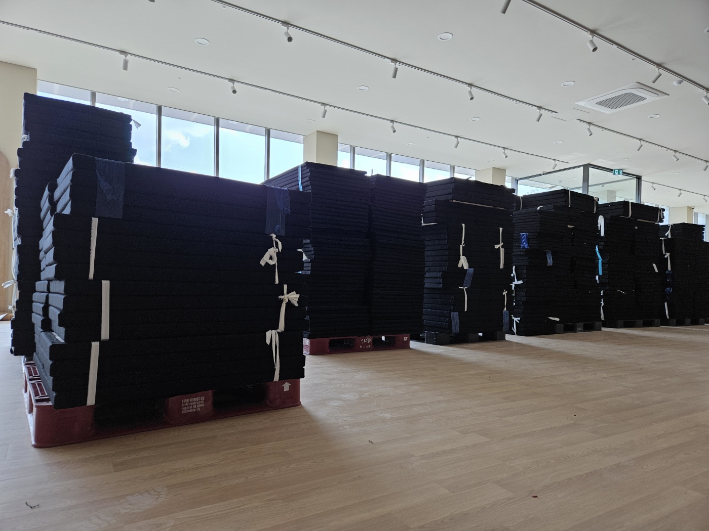 이제 제작 완료된 메모리폼과 스틸 와이어 작업할 자재등을 싣고 현장으로 달려갑니다. 현장 1층에 하역한 스크린골프 메모리폼 제품입니다.이제 제작된 제품을 11개 룸에 각각 곰방하여 옮기고 부착 시공 작업을 해야합니다.
