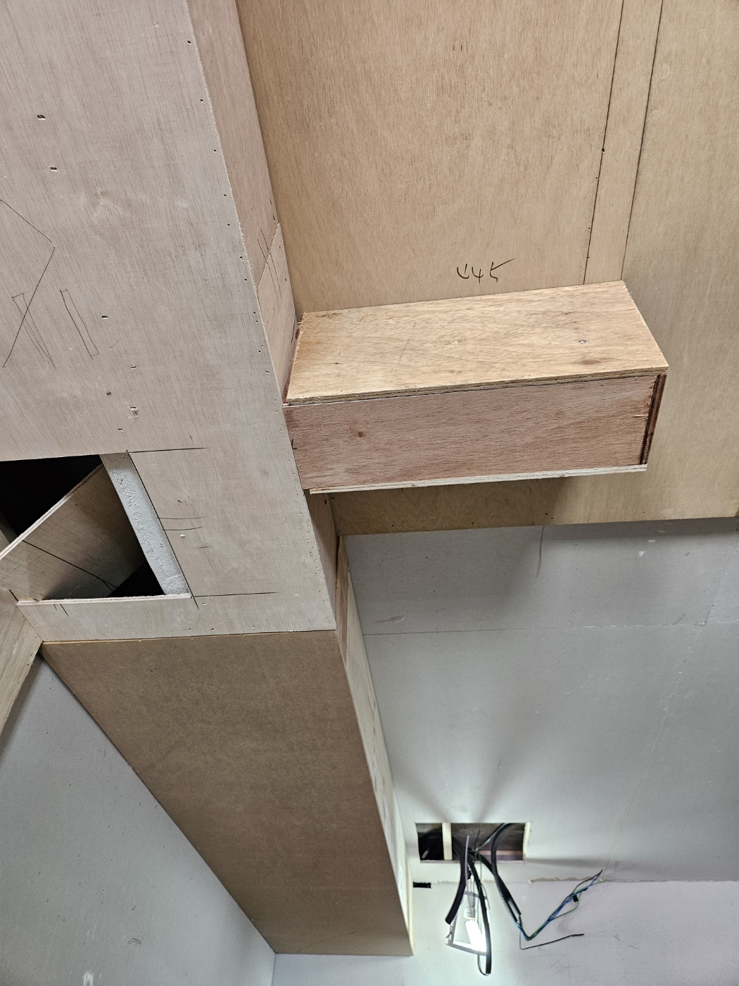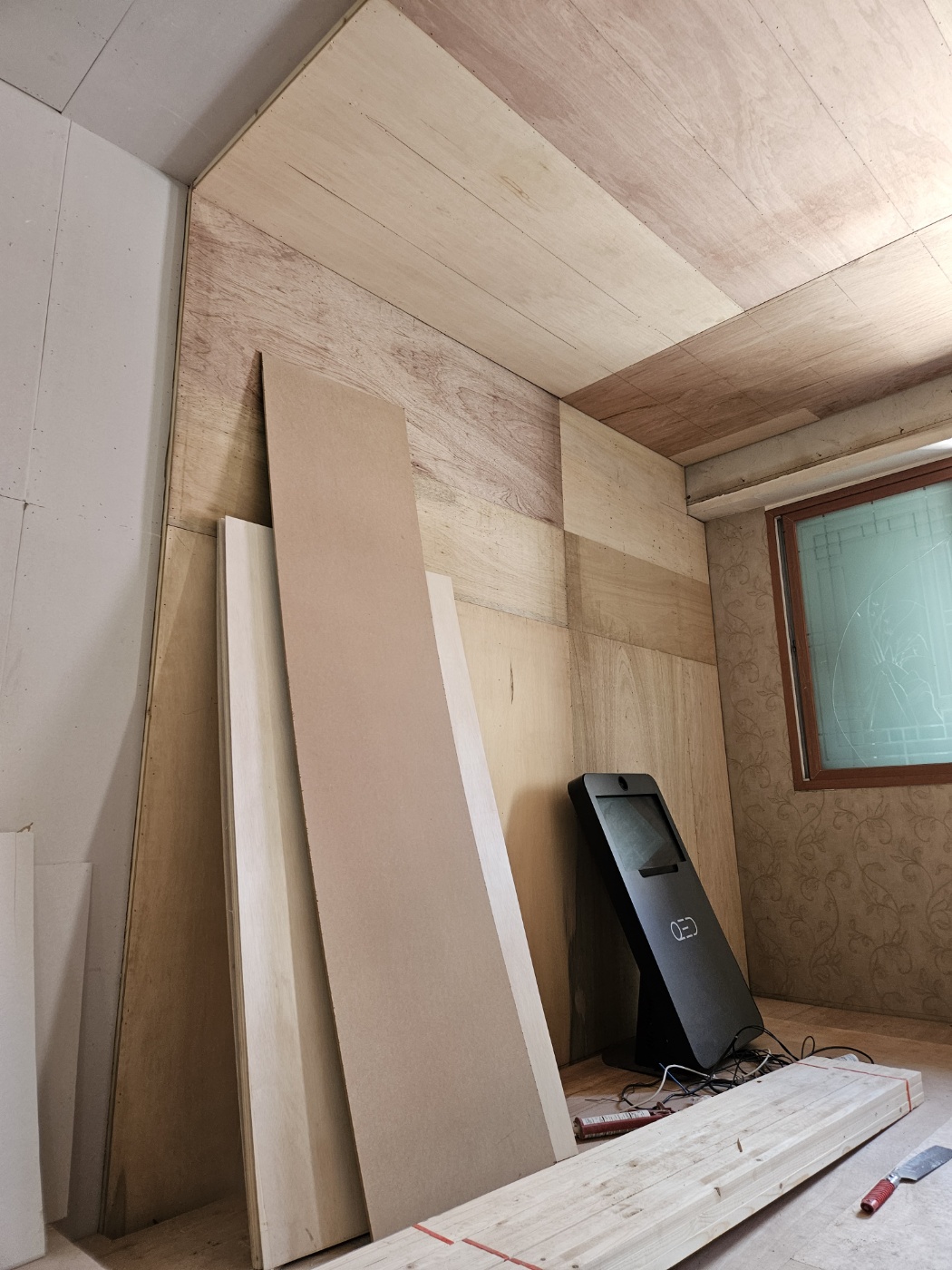 현장에는 보가 지나가고 특히 돌출된 기둥이 있어 마감에 시간이 소요되었습니다. 창문은 합판으로 나중에 막았습니다.