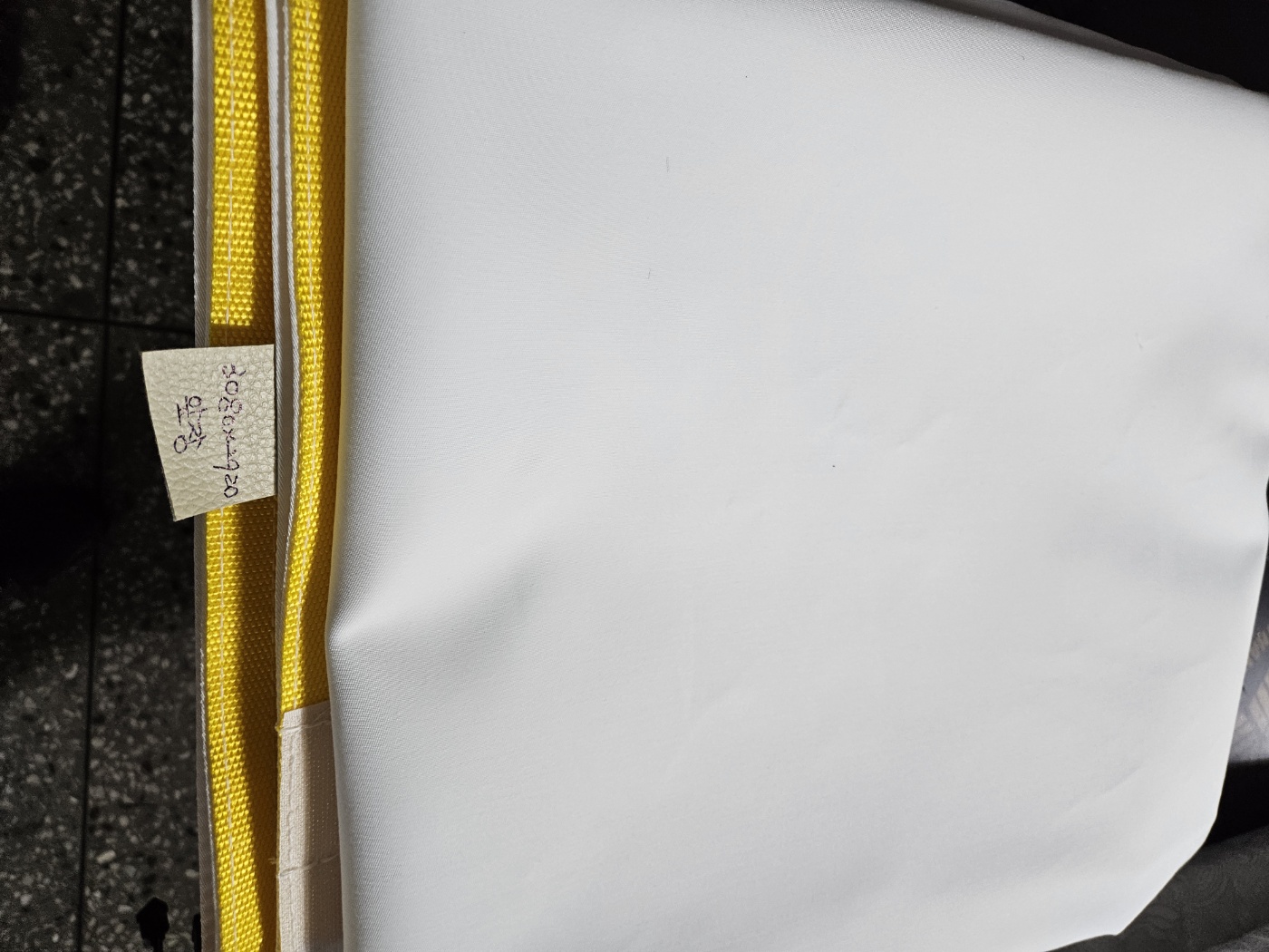 스틸 와이어 시공사진입니다. 걸고리 간격을 촘촘히 하여 텐션을 강화시켜주었습니다. 비너를 걸어 줄 목재도 따로 준비해 튼튼하게 시공했습니다. 그리고 KFI 인증 난연2급 딱지가 붙어 있는 원단입니다. 소방법 통과를 위해 필수적인 메모리폼 원단입니다.