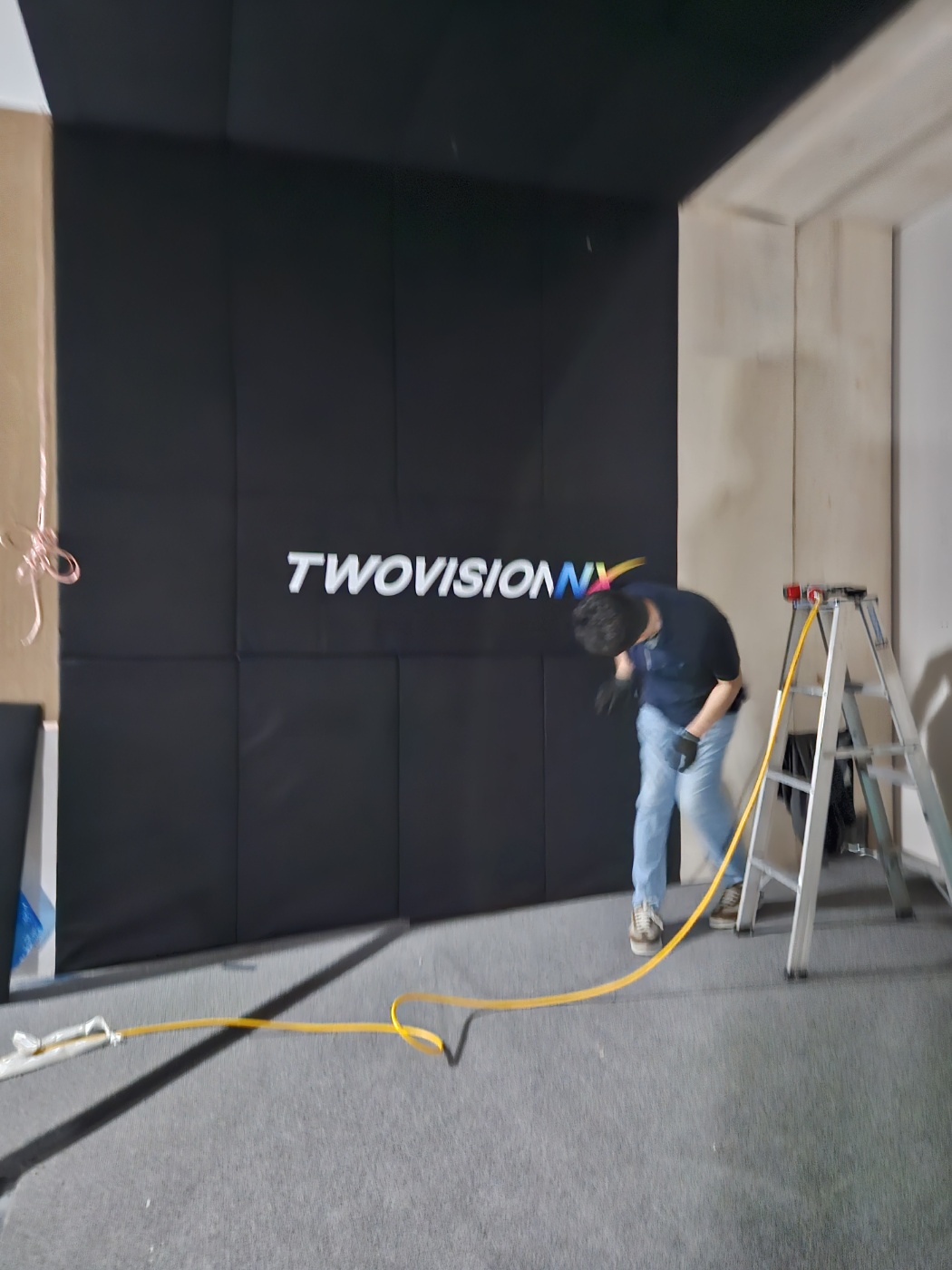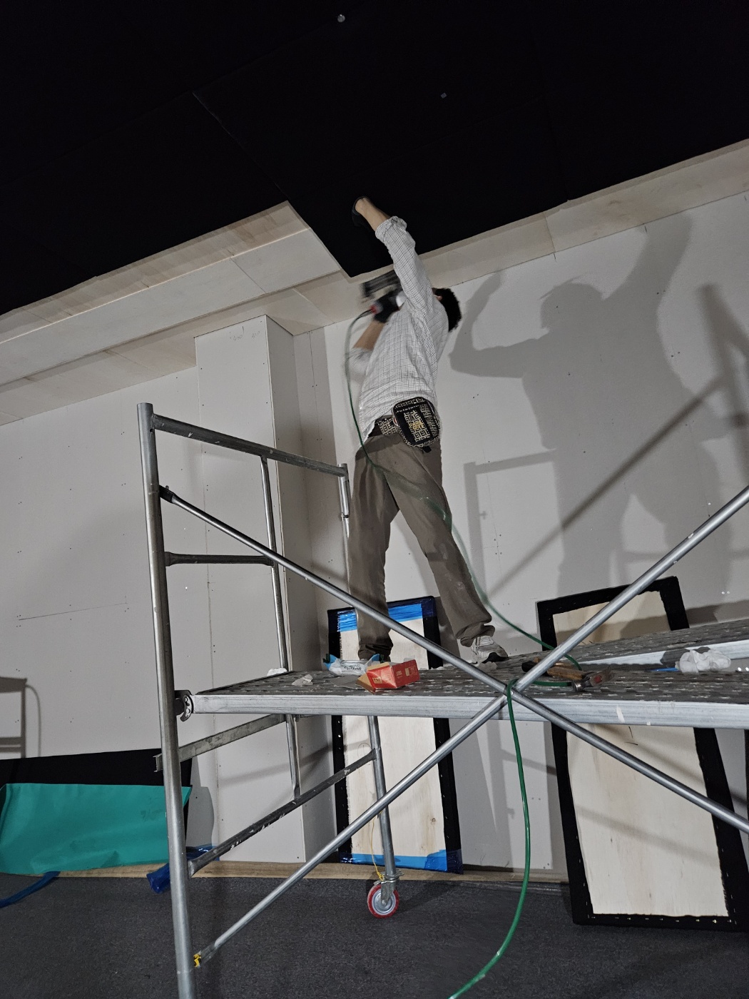 이런 대형 현장에는 아시바가 있어야 고소 작업이 안전하게 진행됩니다. 장비가 좋으니 힘든 천장 메모리폼 부착 시공 작업이 빠르게 마무리 되었습니다. 로고 인쇄된 부분도 보기 좋게 잘 부착된 상태입니다.