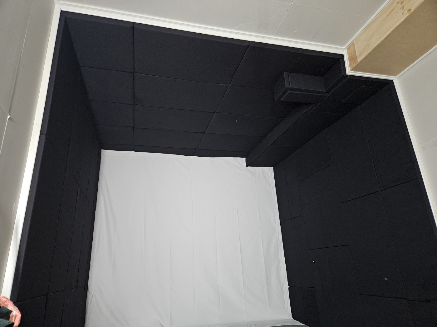 메모리폼 시공은 천장 부터 부착합니다. 제작해 간 메모리폼이 잘 맞아야 양쪽 벽체에 붙일 폼도 모양이 틀어지지 않습니다.