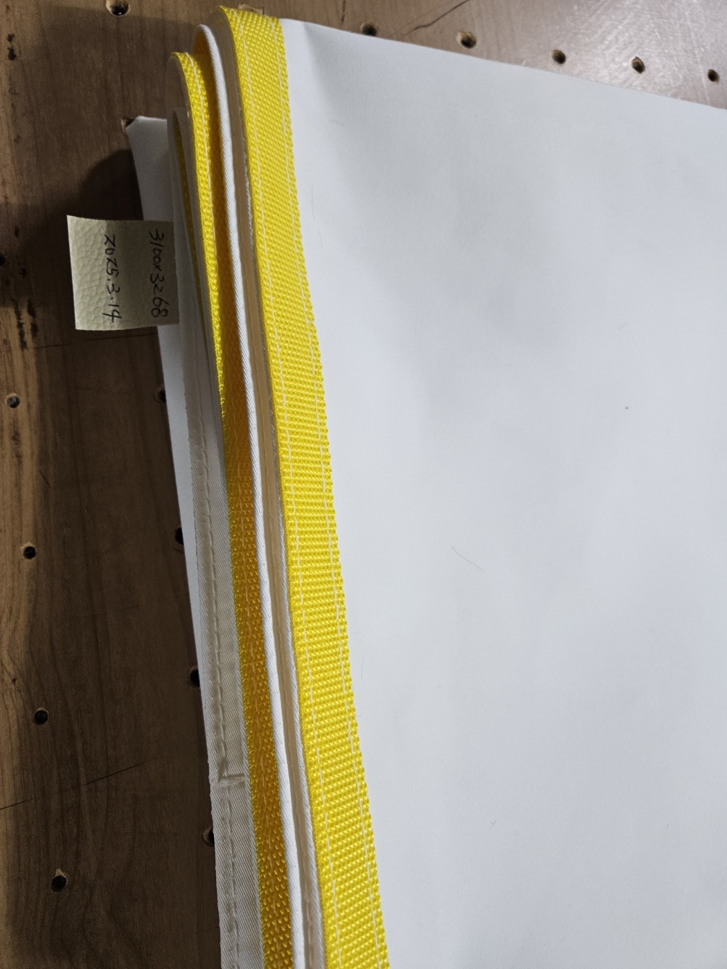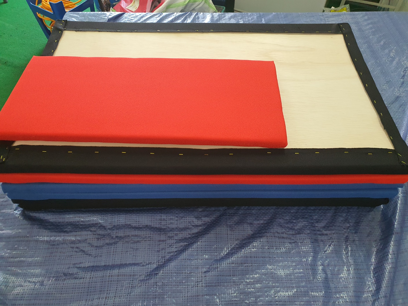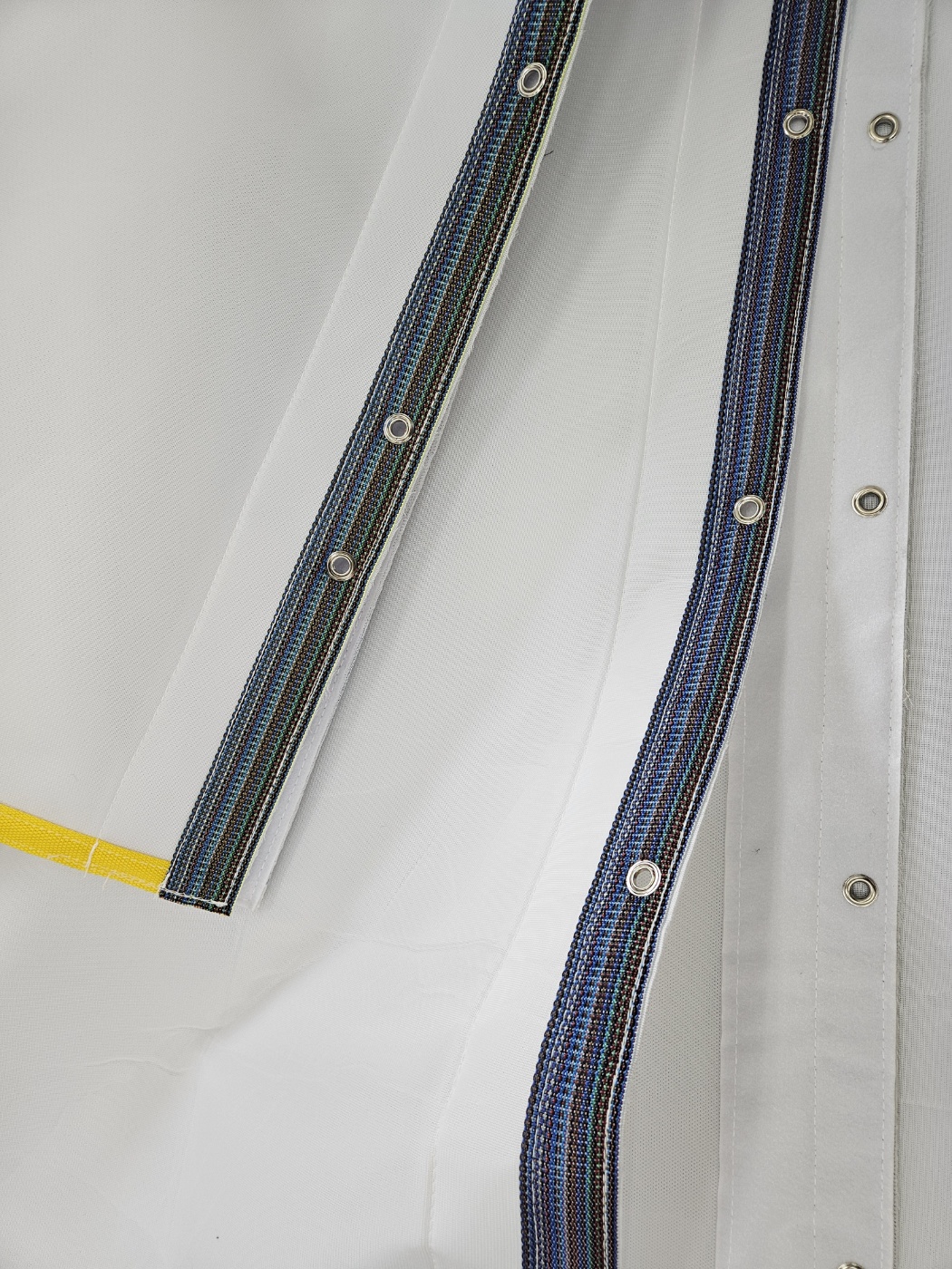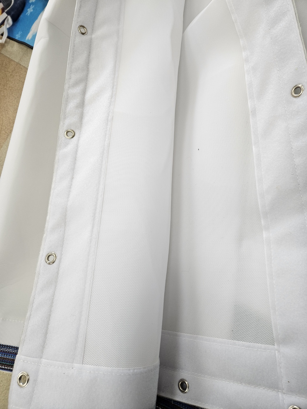 뒷천은 주로 3면 아일렛 타공을 해서 스틸와이어와 연결 묶을수 있게 제작하고 앞천은 훼손이나 찢어질 때 떼어내서 교체 부착 할 수 있도록 찍찍이를 사용해 제작합니다.