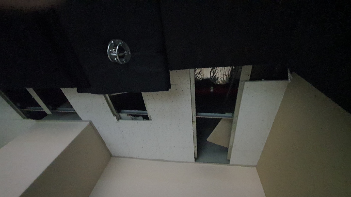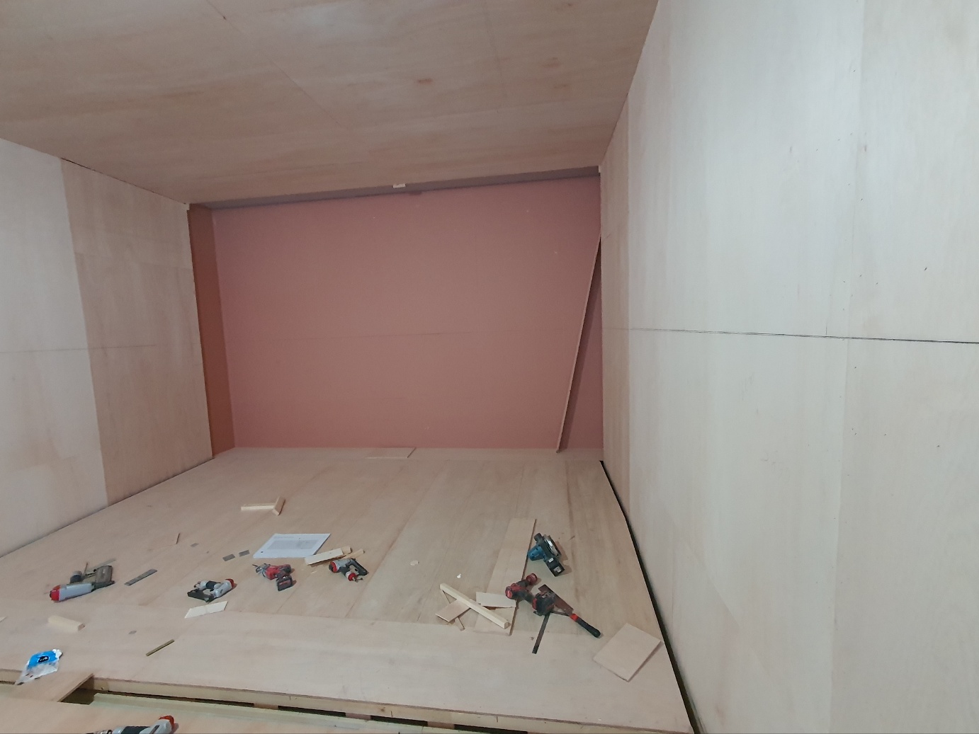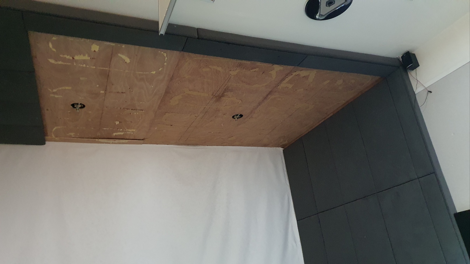 메모리폼을 부착할 천장과 양쪽 벽체에 합판으로 막았고 뒤쪽 벽도 합판으로 막았습니다.