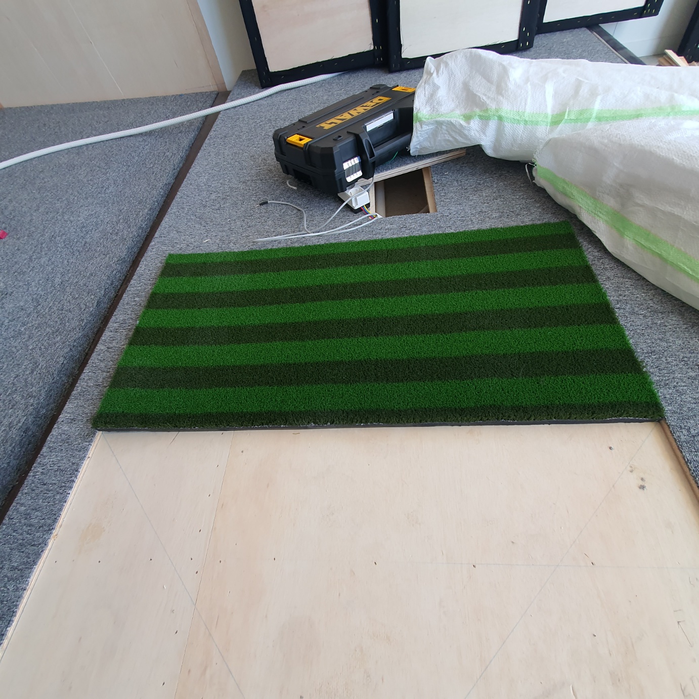 카페트 시공은 공튕김 방지를 위해 바닥에 계란판 스폰지나 부직포 휠타를 깔고 그 위에 카페트 시공을 마무리 하며 타석쪽 논슬립 시공도 잘 마무리해야 합니다.