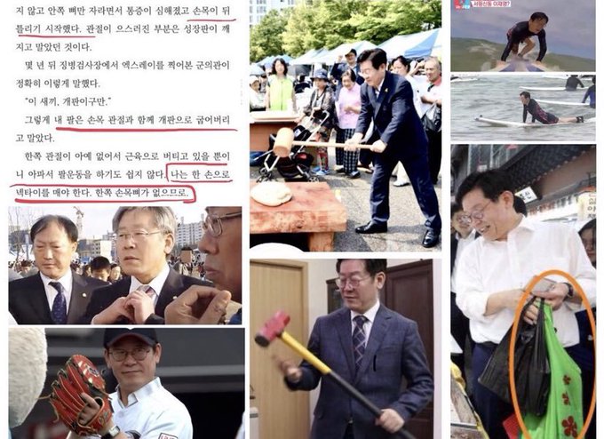이재명 팔에 대해 궁금해서 집안에 또 주변에 의사들이 많아서 사진 보여주면서 “프레스기에 (난 잘모르니까) 다쳤대요” 했더니 모두가 빠짐없이 ‘프레스기에 다치면 팔의 형체가 없거나 빨려들어가 사망인데 무슨소리야?’ 이러면서 면박을 받았다😑