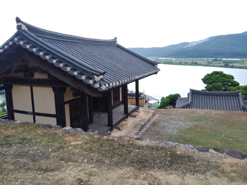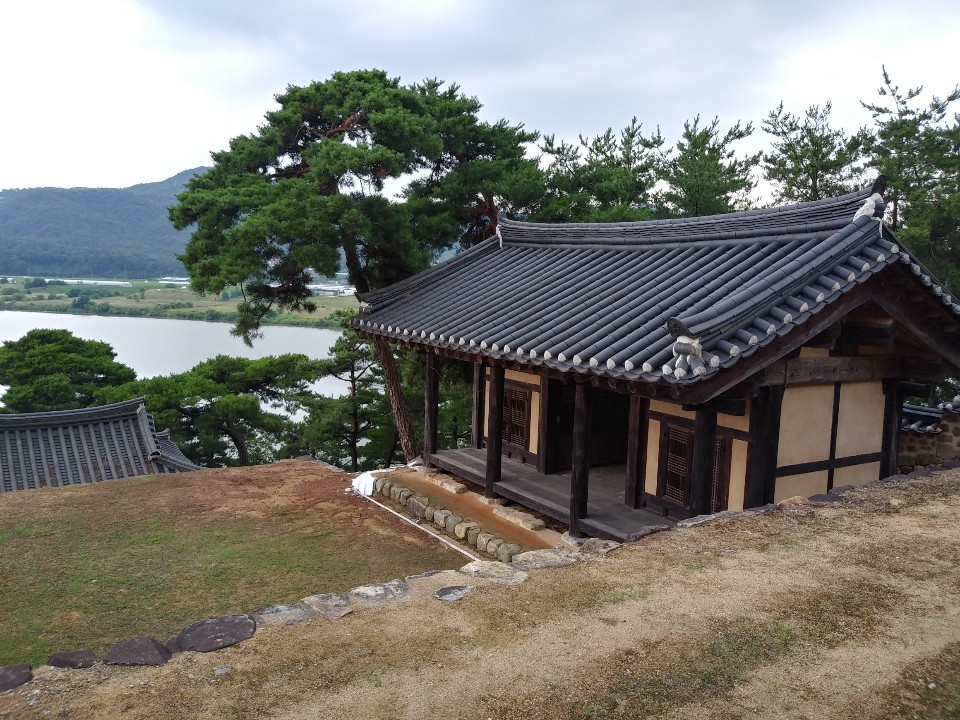동제와 서제 사이로 구인당 지붕이 보이고 그 너머로 낙동강이 흐르고 있다.