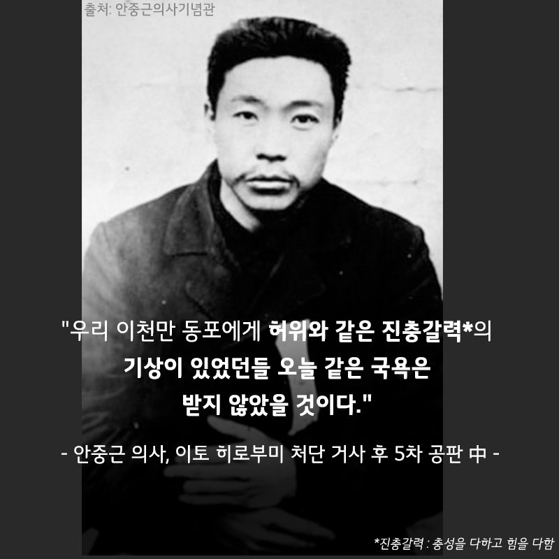 이토 히로부미를 처단하는 거사 후 5차 공판에서 대한의군 참모중장 안중근 장군은 "우리 이천만 동포에게 허위와 같은 진충갈력의 기상이 있었던들 오늘같은 국욕은 받지 않았을것이다" 라고 말했다.
