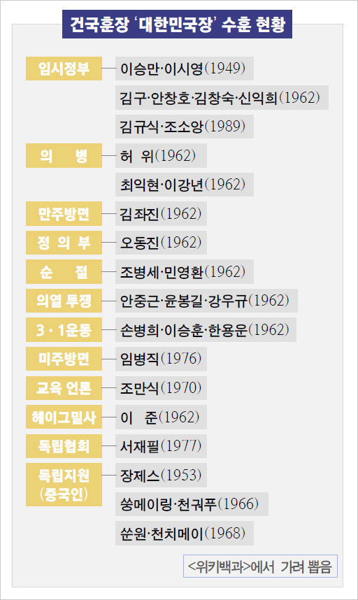 건국훈장은 1등급 대한민국장에 이어 대통령장, 독립장, 애국장, 애족장, 건국포장, 대통령 표창이 있다.