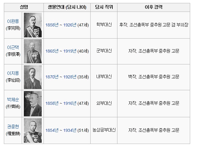 을사오적이란 을사늑약 체결에 찬성했던 학부대신 이완용, 내부대신 이지용, 외부대신 박제순, 군부대신 이근택, 농상공부대신 권중현을 가리키는 대명사가 된 말이다.