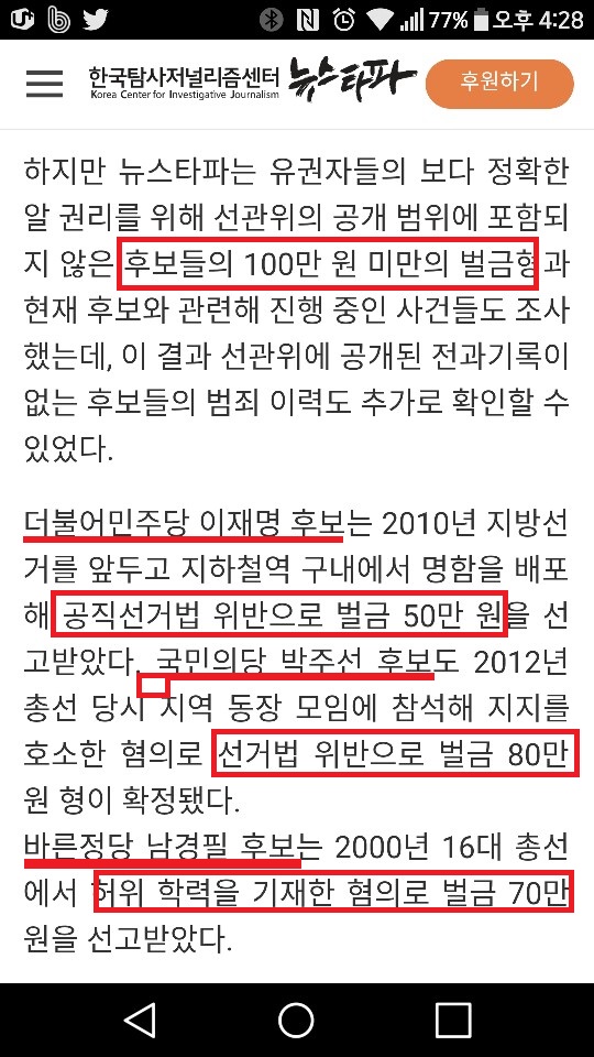 ※ 공직선거에 출마하는 예비후보들의 중앙선과위에 등재된 전과기록 내역 보도는 선거법에 저촉되지 않는다는 것이 중앙선관위의 답변이다. 100만원 미만의 전과기록에 대해서는 '중앙선관위 선거통계시스템' 열람으로는 각 정당이나 유권자들이 확인할 방법이 없는 상태를 감안하면 실제 전과가 더 늘어날 수 있다는 점을 감안해야 한다. 이 부분에 대해선 각 정당에서 예비후보자들에게 서약서를 받는다고 한다.