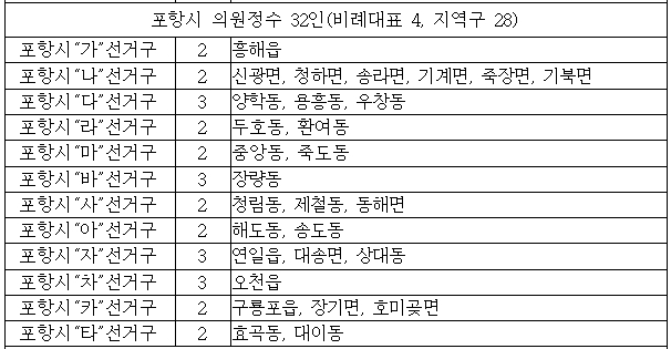 포항시 의원 정수 32인 (비례대표 4, 지역구 28)